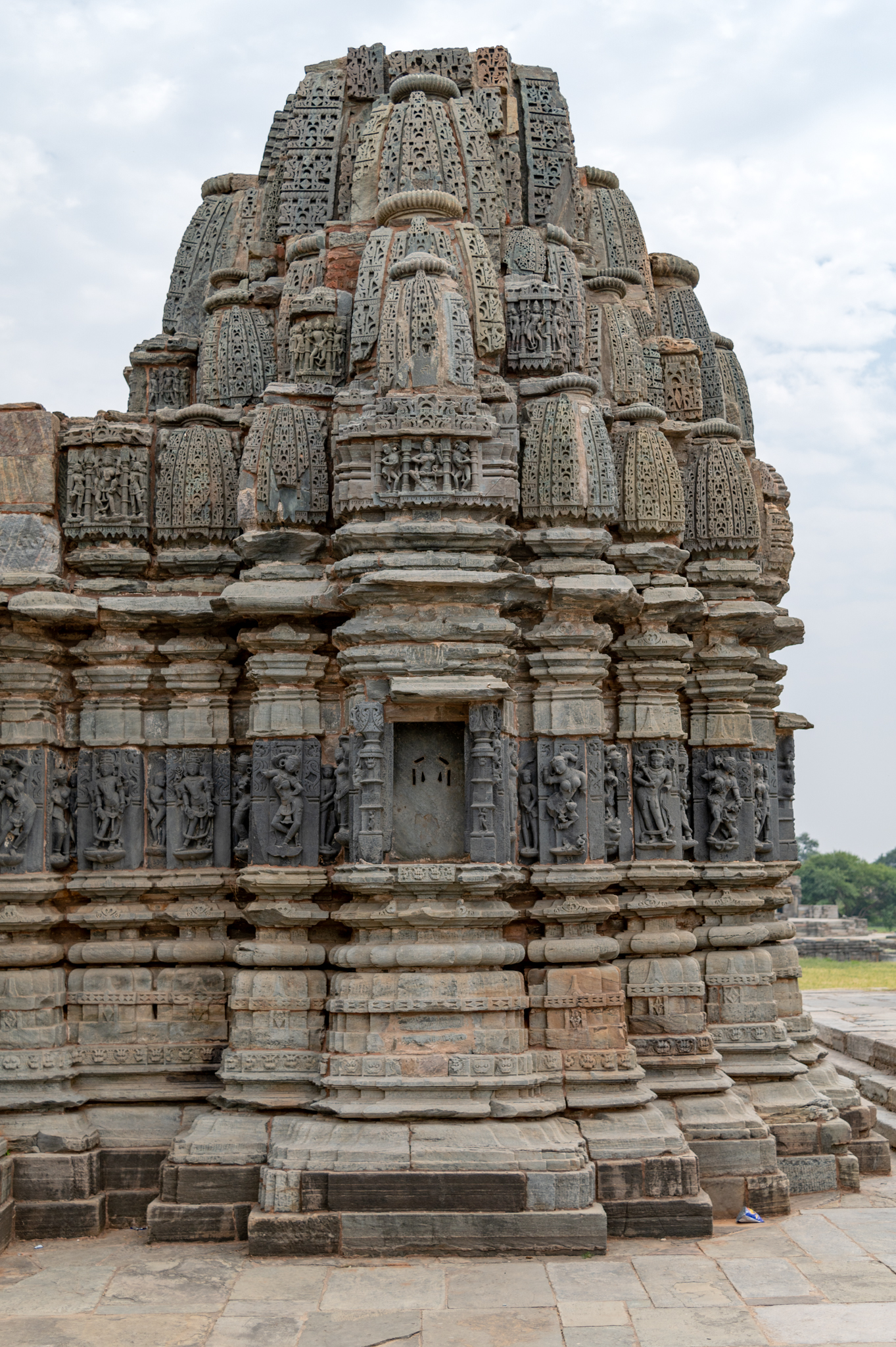 Seen here is the mulaprasada (main shrine) of the Jain Temple. The temple elevation has a vedibandha (basal mouldings) with minimal ornamentation, followed by a jangha (wall) which has figural sculptures and an intricately carved multi-spired shikhara (superstructure).