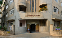 Entrance and lettering, Empress Court. Built in 1933-39, Empress Court was designed by architects Contractor and Kanga with additional designs by Gajanan Babu Mhatre. Most of the residential buildings along Maharshi Karve Marg were designed by Indian developers and architects, rather than British architects.