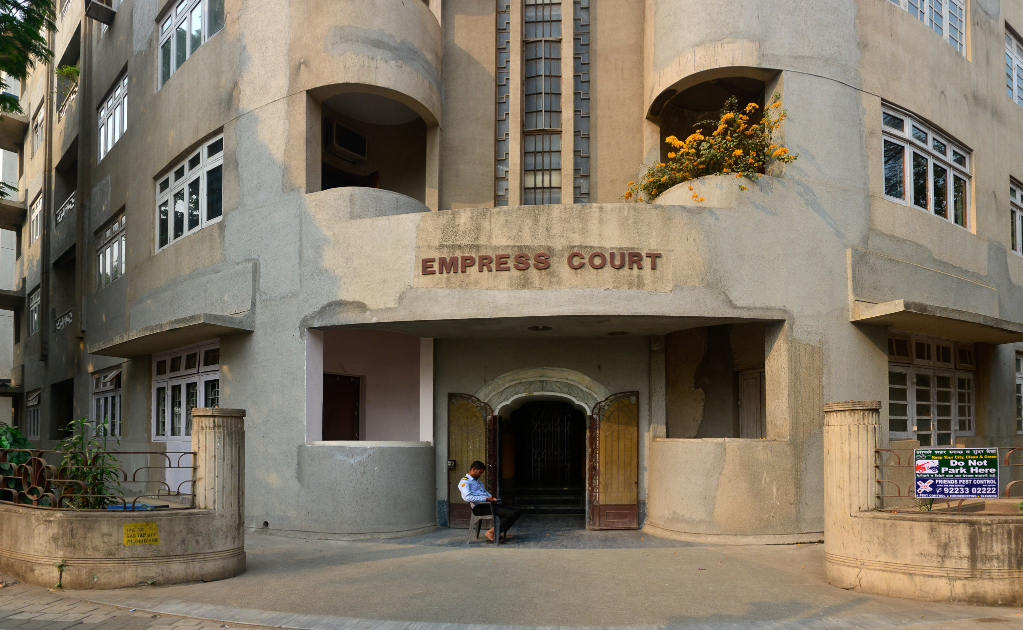Entrance and lettering, Empress Court. Built in 1933-39, Empress Court was designed by architects Contractor and Kanga with additional designs by Gajanan Babu Mhatre. Most of the residential buildings along Maharshi Karve Marg were designed by Indian developers and architects, rather than British architects.