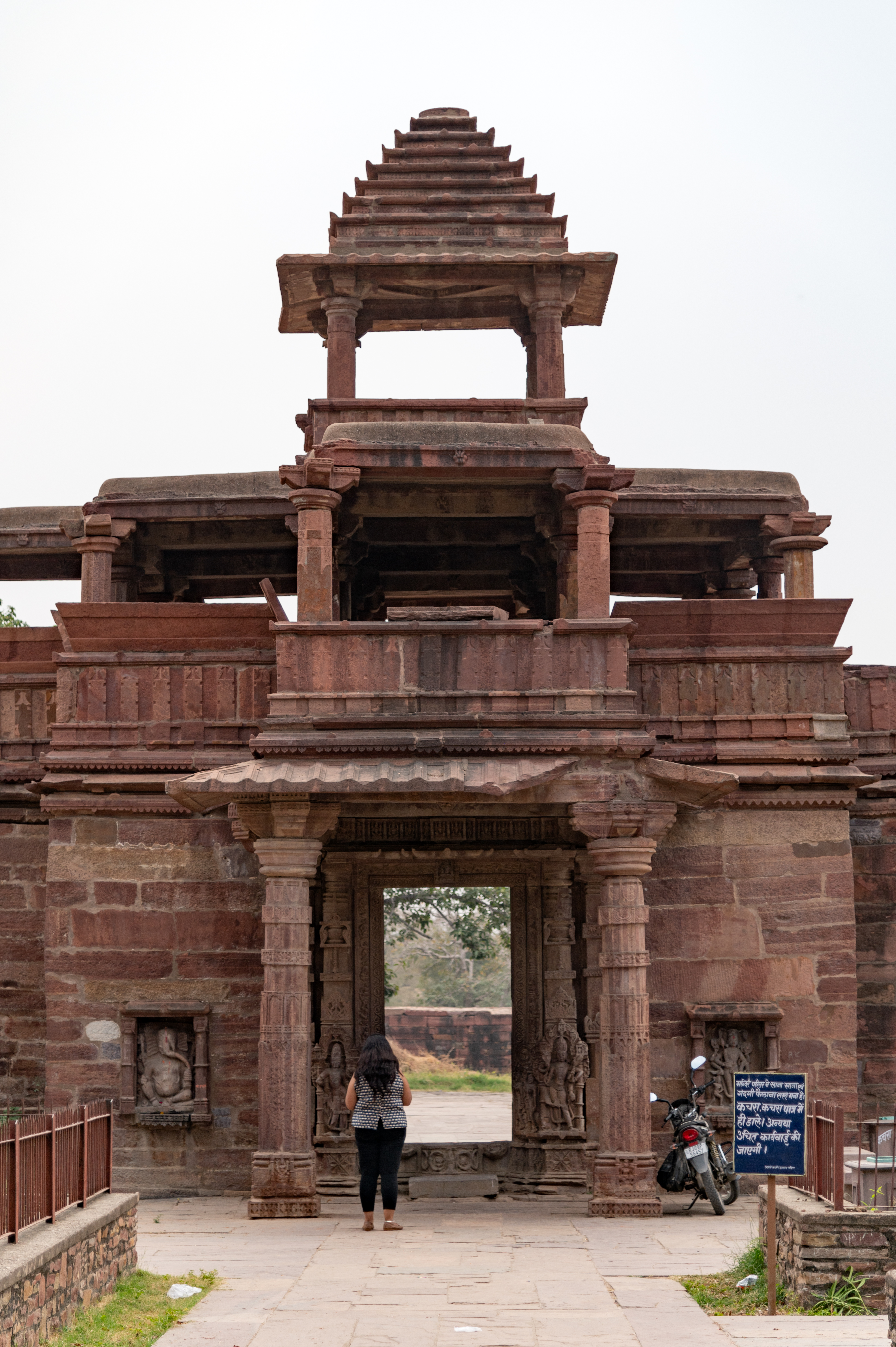 Pictured here is the north-facing view of the two-storeyed entrance gateway of the Mahanaleshwar temple complex. It is a semi-open space with a porch on the ground floor, a plain balcony with dwarf walls on the first floor, and a canopy with a pyramidical spire on the top.