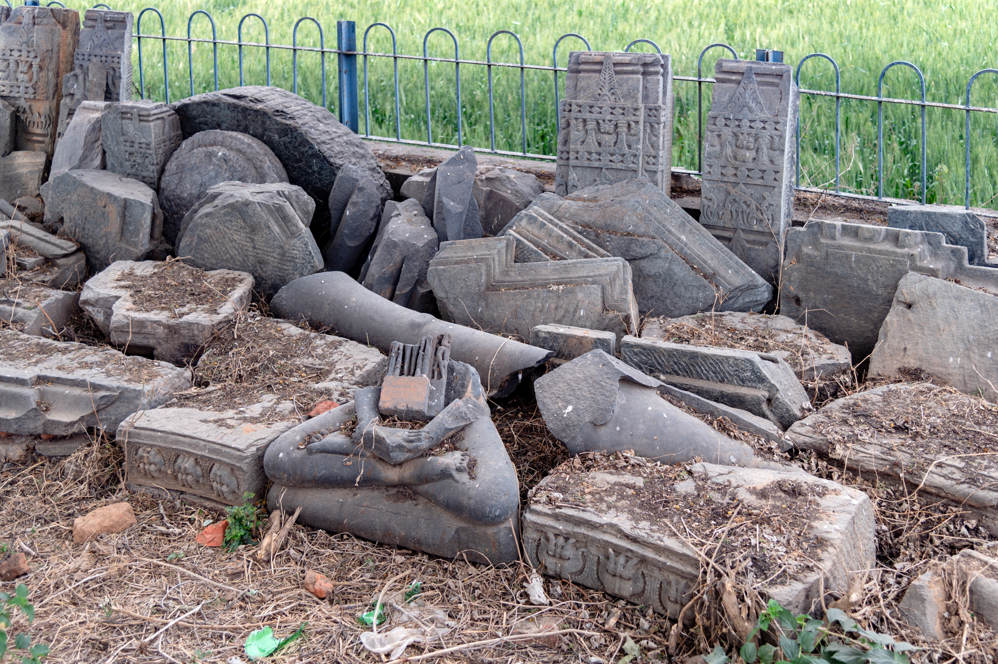Seen here are the scattered architectural fragments in the Jain temple complex consisting of several architectural members along with a Jina sculpture seated in padmasana (lotus pedestal). It is likely that all these architectural and sculptural remains originally formed part of the Jain temple complex. Since the central shrine of the Jain temple is well preserved, the fragments of the wall with floral ornamentation might have been part of the side shrines in this complex.