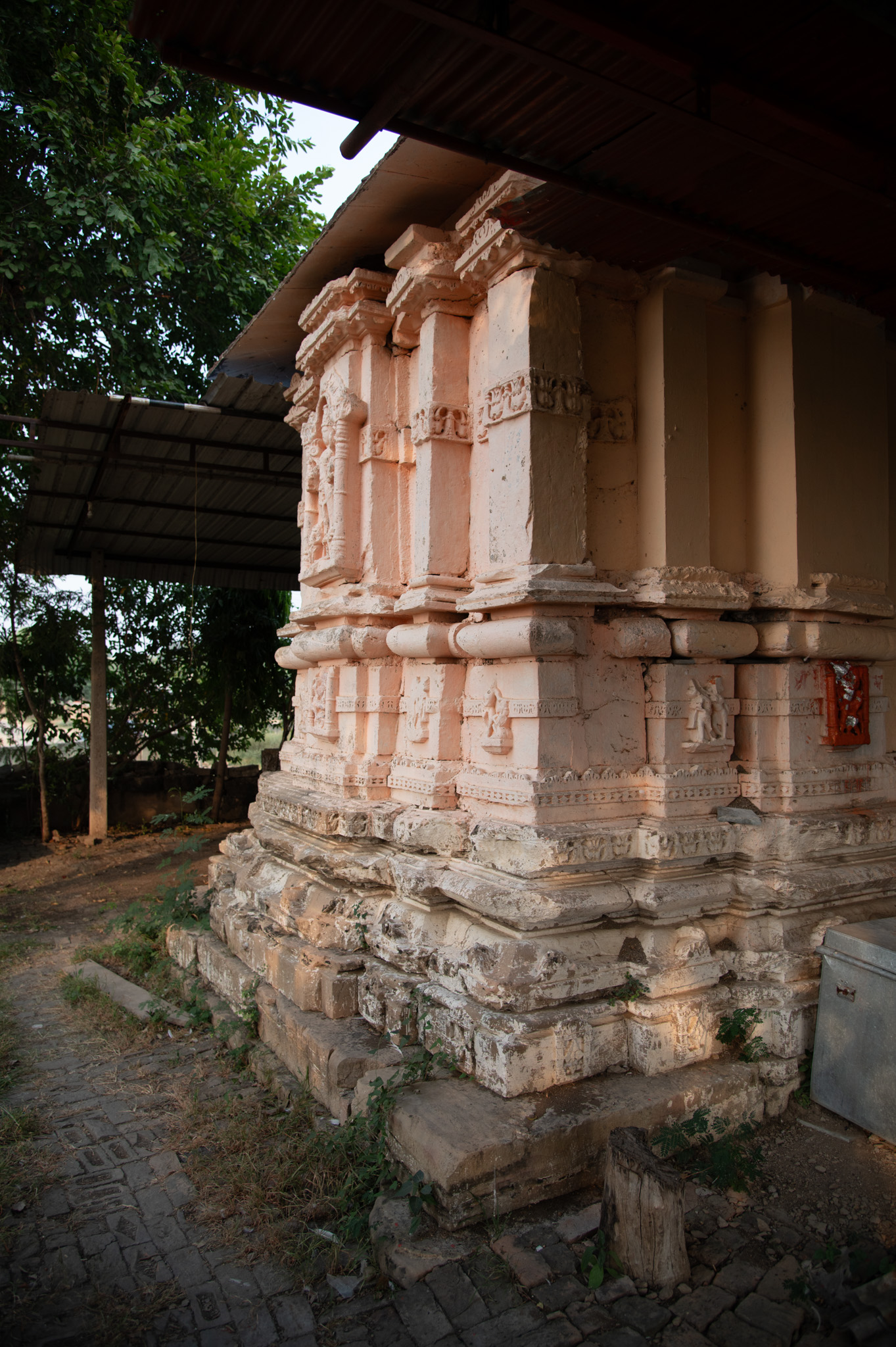The garbhagriha shows the vedibandha and jangha on its vertical axis. The vedibandha comprises various mouldings such as pitha, kapotapailka, karnika, grassapatta, manibandha, gaggarika, kumbha and kalasha. The jangha has a bhadra and karna and a horizontal band at the center runs across the wall.
