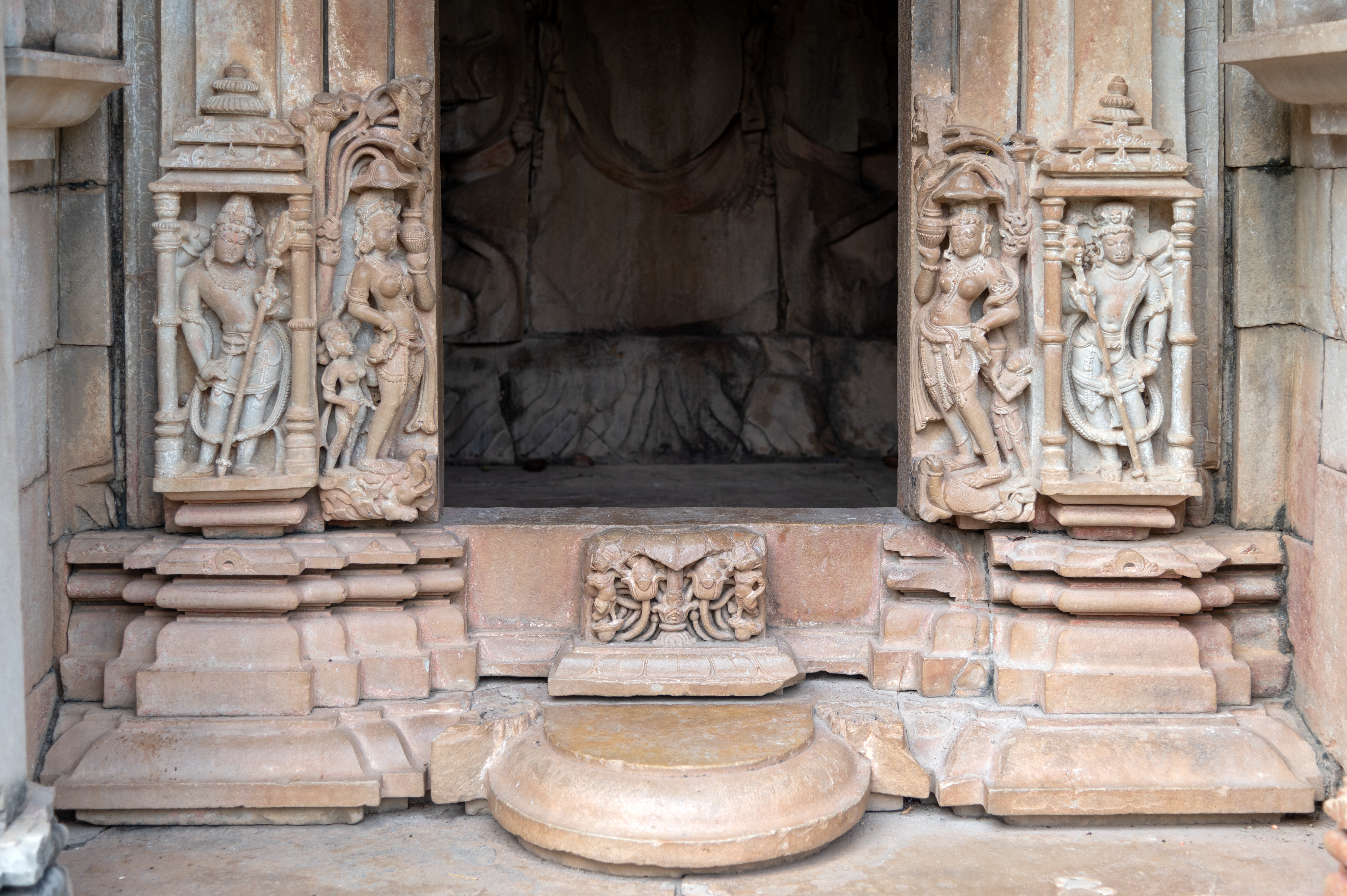 The entrance gate to the garbhagriha (sanctum sanctorum) of the Sadashiva Temple features plain shakhas (vertical bands), while the bottom part depicts river goddesses Ganga and Yamuna, as well as Shiva dvarapalas (door guardians). Ganga is shown on the proper right, holding a water pot, standing on her vahana (mount), a makara (crocodile). Yamuna is shown holding a water pot and standing on her mount, a kachhapa (tortoise). The dvarapalas are depicted holding weapons.