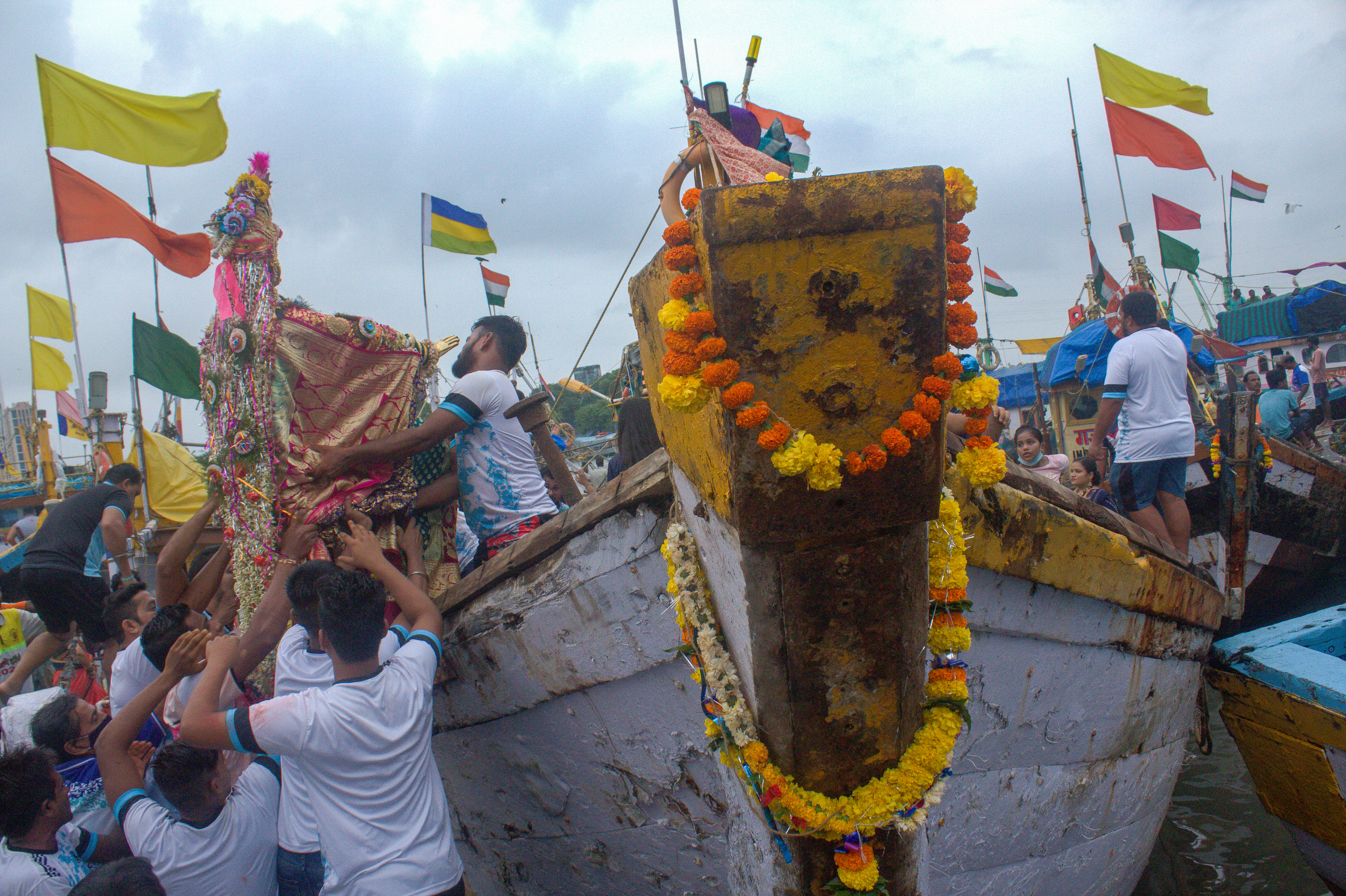 The fishing boats are specially painted and decorated on the occasion of Narali Purnima, which takes place a few weeks before Jyestha Gauri Puja. The boats are decked with floral garlands and colourful flags as the new fishing season commence at the end of the monsoon season.