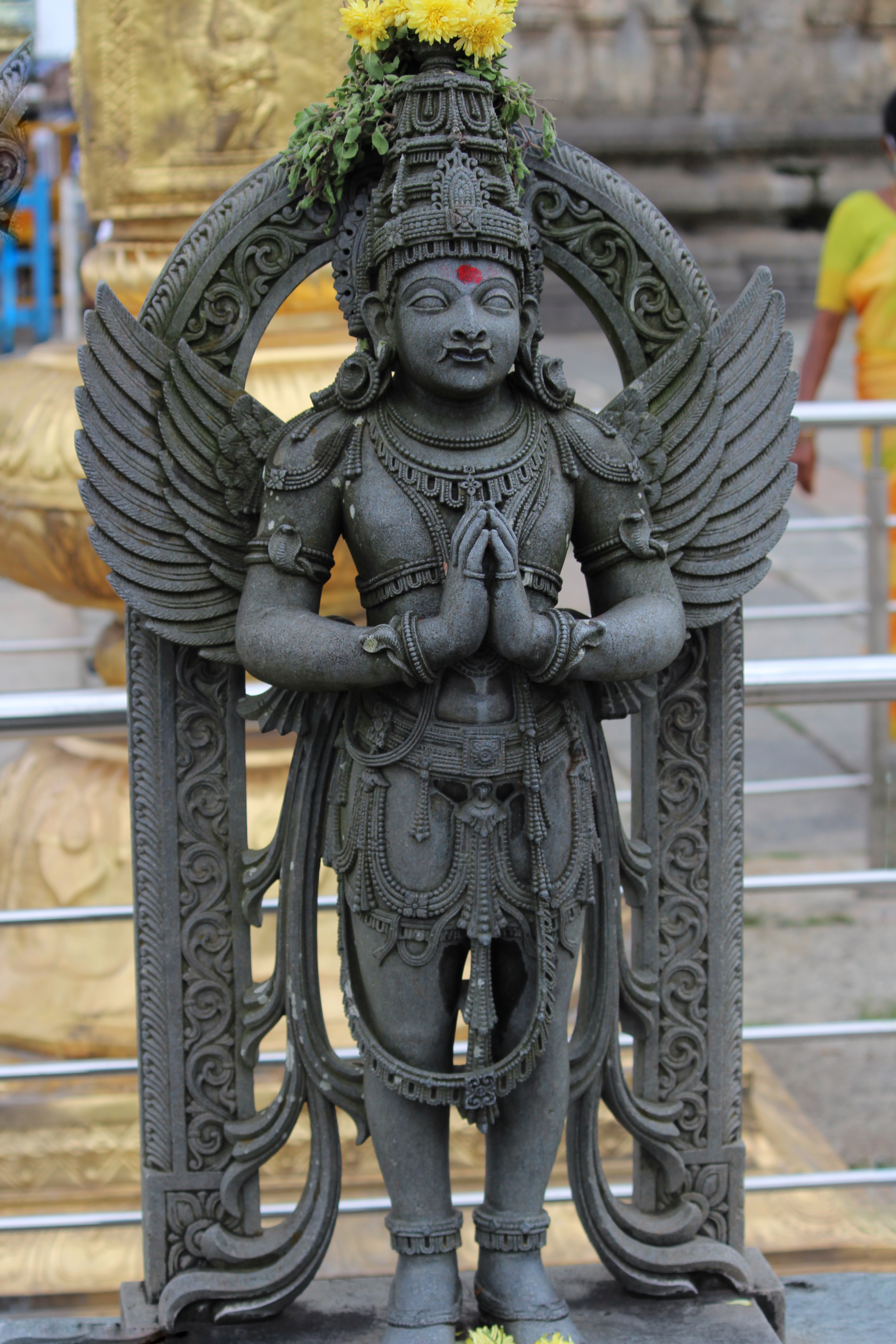 In the Chennakeshava temple placed at the foot of the Dhvaja-sthamba is a sculpture of the divine bird Garuda, who is part bird and part human and is the mount of God Vishnu. This sculpture, though has Hoysala-style carvings, is a recent one sculpted by Javaracharya from Mysore in the early 20th century.
