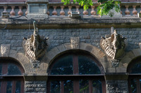 The maritime nature of the Port House (Old Bombay Port Trust Building) is highlighted by the presence of medieval ships projecting from the wall on the upper level of the porch. Two ships jut out of the wall, only half of their length visible. Both feature a figurehead of a winged angel attached to the bow (the forward-most part of the ship).