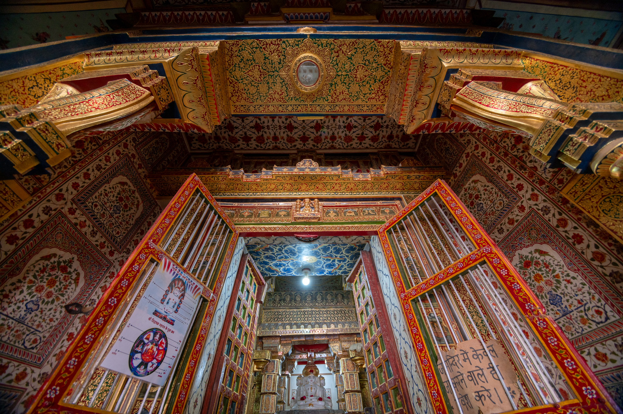 Details of the garbhagriha (sanctum sanctorum) entrance of the Bhandasar Temple. The beam, pilasters and brackets are covered with meenakari (enamel) gold work. The walls flanking the entrance opening have the same floral paintings found on the walls and ceiling of the temple.