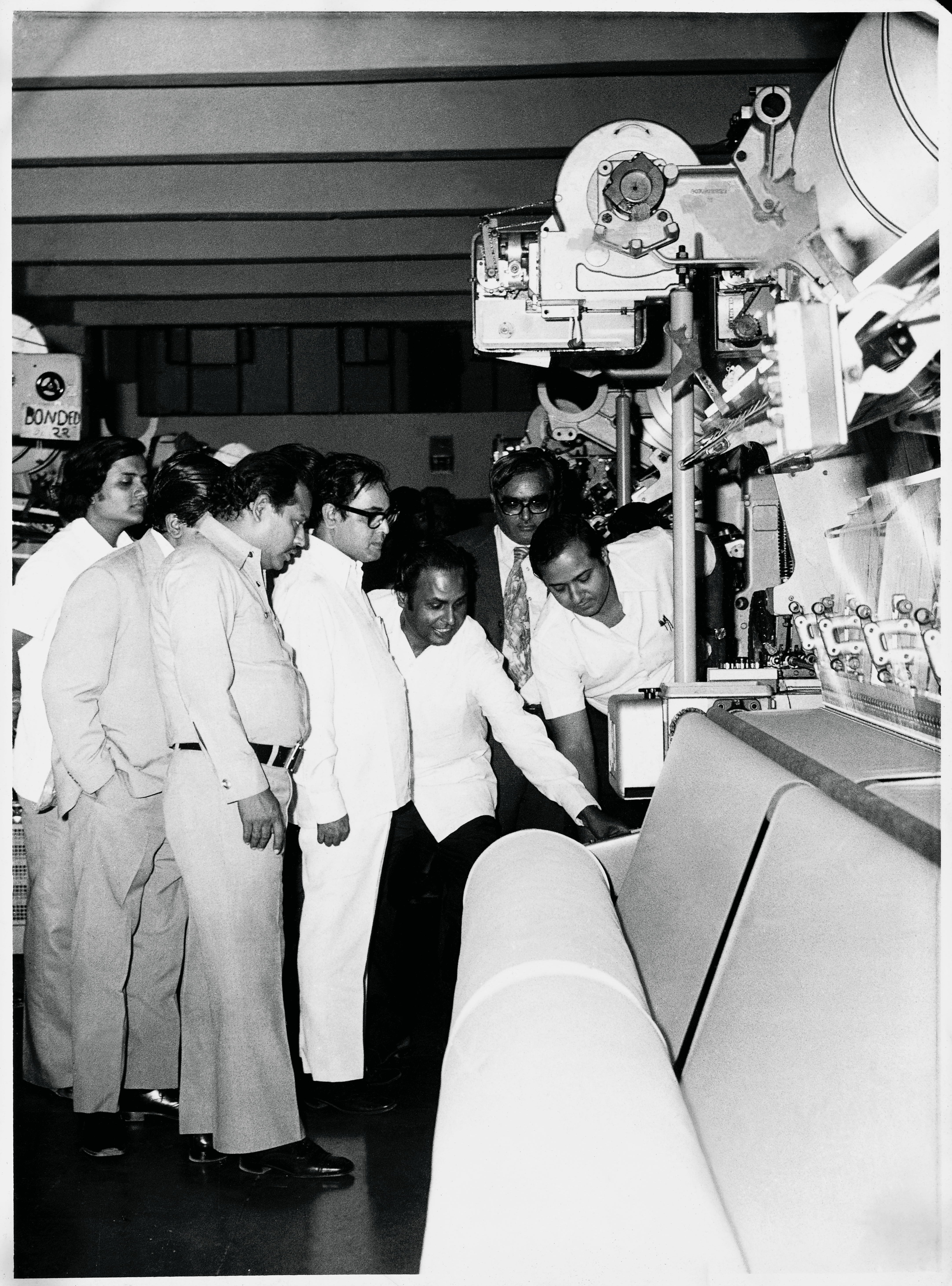 The establishment of the Reliance textile mill at Naroda marked Shri Dhirubhai Ambani's move from yarn trading to fabric manufacturing. Reliance Commercial Corporation now became Reliance Textile Industries Private Limited. Here, Shri Dhirubhai Ambani is displaying the German warp knitting machinery at Reliance Naroda. Image Courtesy: Reliance Industries Limited.