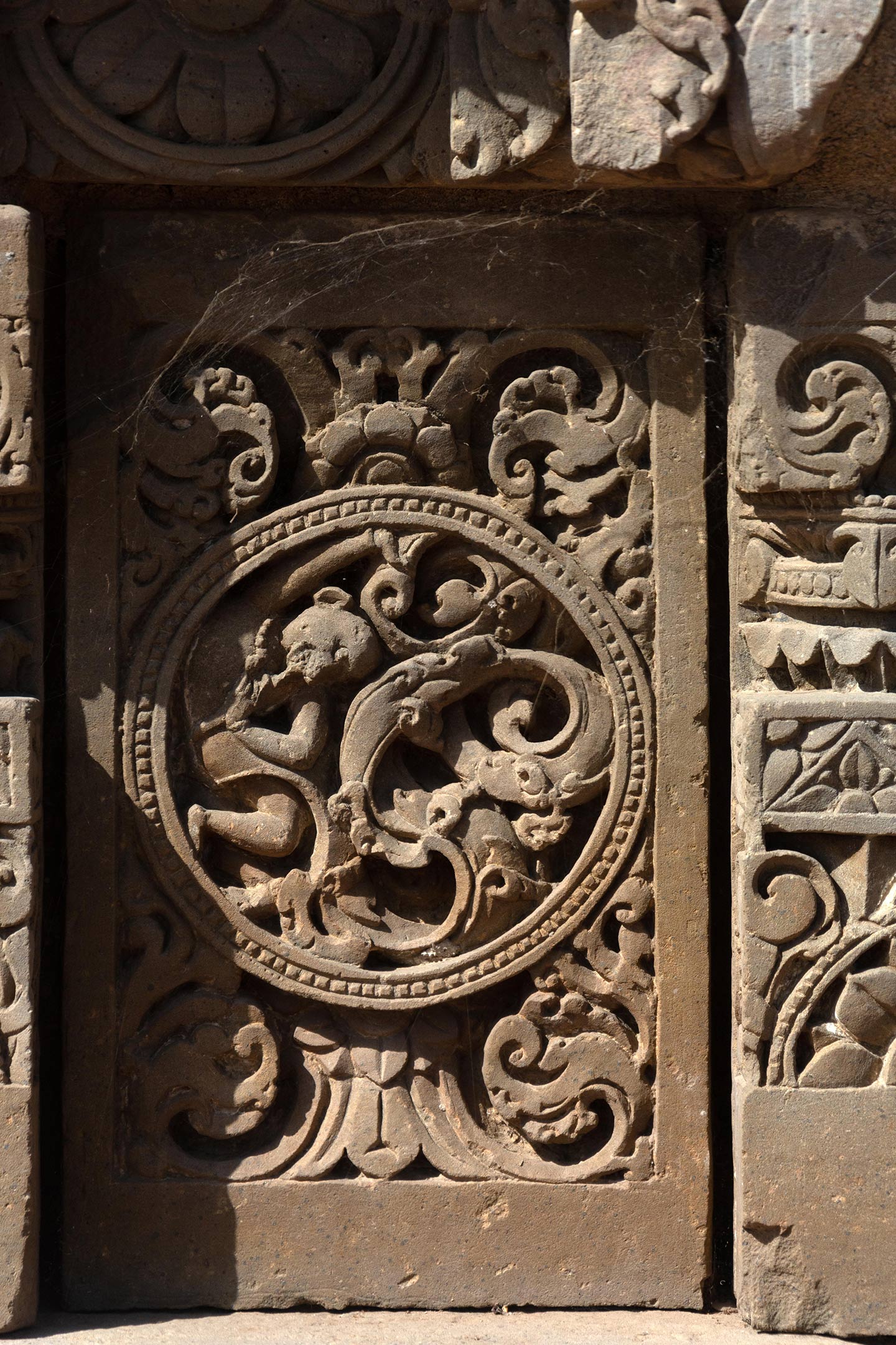 Tablet-like plaques are placed on the adhisthana (facing east). These plaques depict various types of flora and fauna as well as hybrid creatures like kinnara, vyala, and makara. The plaques are tightly arranged, richly detailed, and deeply carved, creating contrasting shadows that make the artwork look three-dimensional in sunlight. The central artwork of the plaque is in the form of a circular medallion surrounded by a foliage motif. In this plaque, a human figure (acrobat/dancer) is doing an acrobatic/dance pose that merges with a creeper motif. Ardha padma (half lotus) and kalpa lata (creeper) motifs are carved on the rest of the plaque surface. The plaques are separated by squat pillars which have a square base, an octagonal shaft, and a square capital. The pillars are decorated with ardha padma (half lotus) and kalpa lata (creeper) motifs.