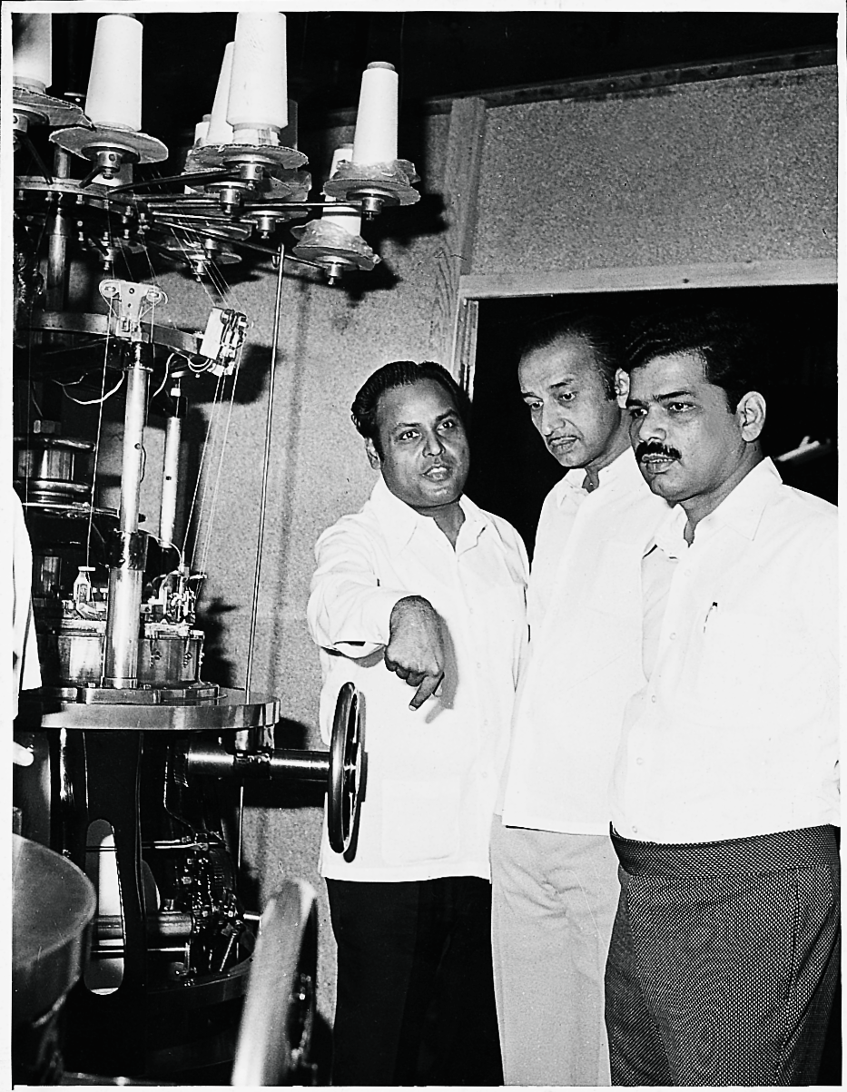 Shri Dhirubhai Ambani is seen explaining the features of the German circular yarn knitting machine. Image Courtesy: Reliance Industries Limited.