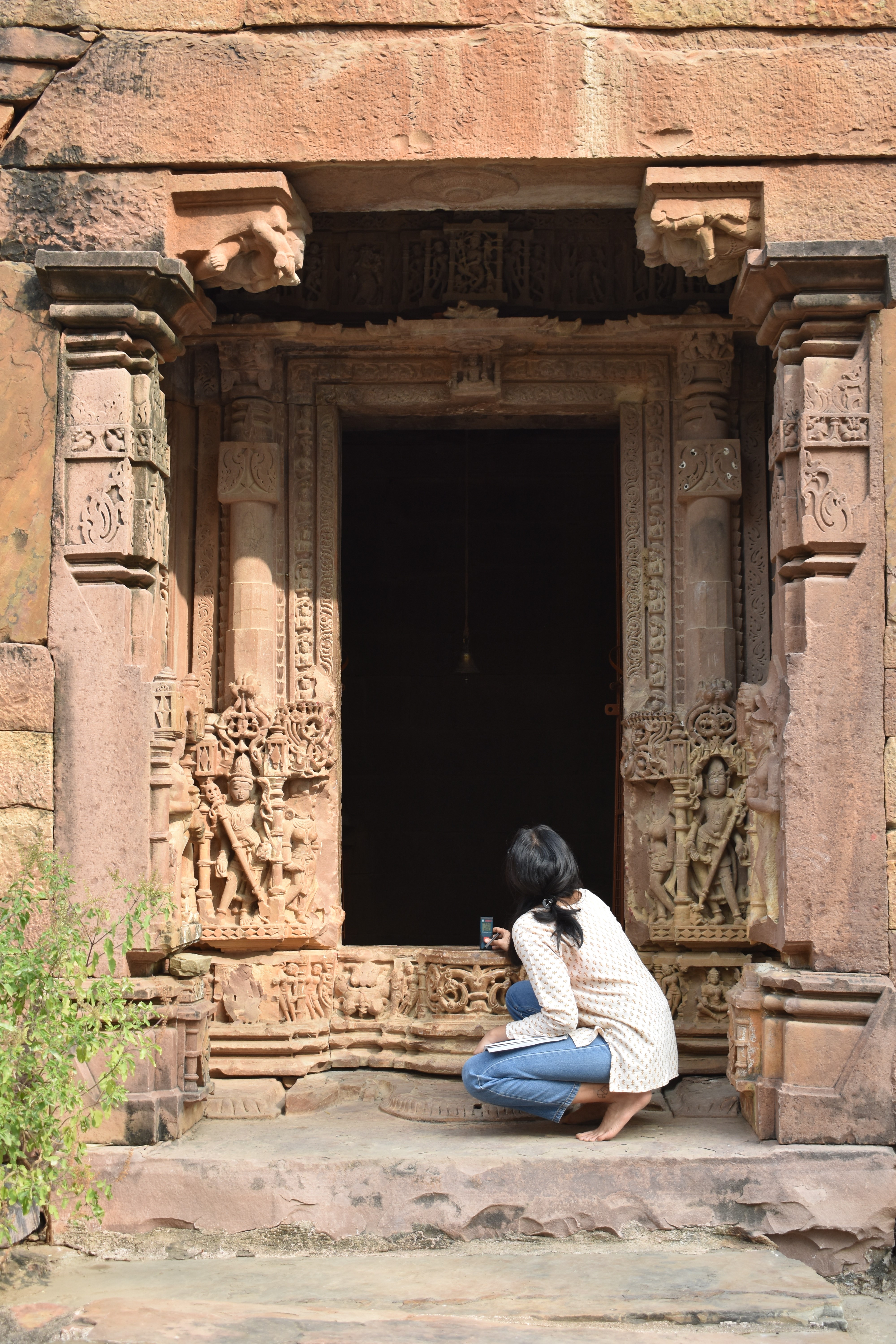 Ar. Mrunal Nidadavolu measuring the entrance height of Kaner-ki-Putli Temple, Bhilwara district, Rajasthan. Image courtesy: Vrinda Dhiman)