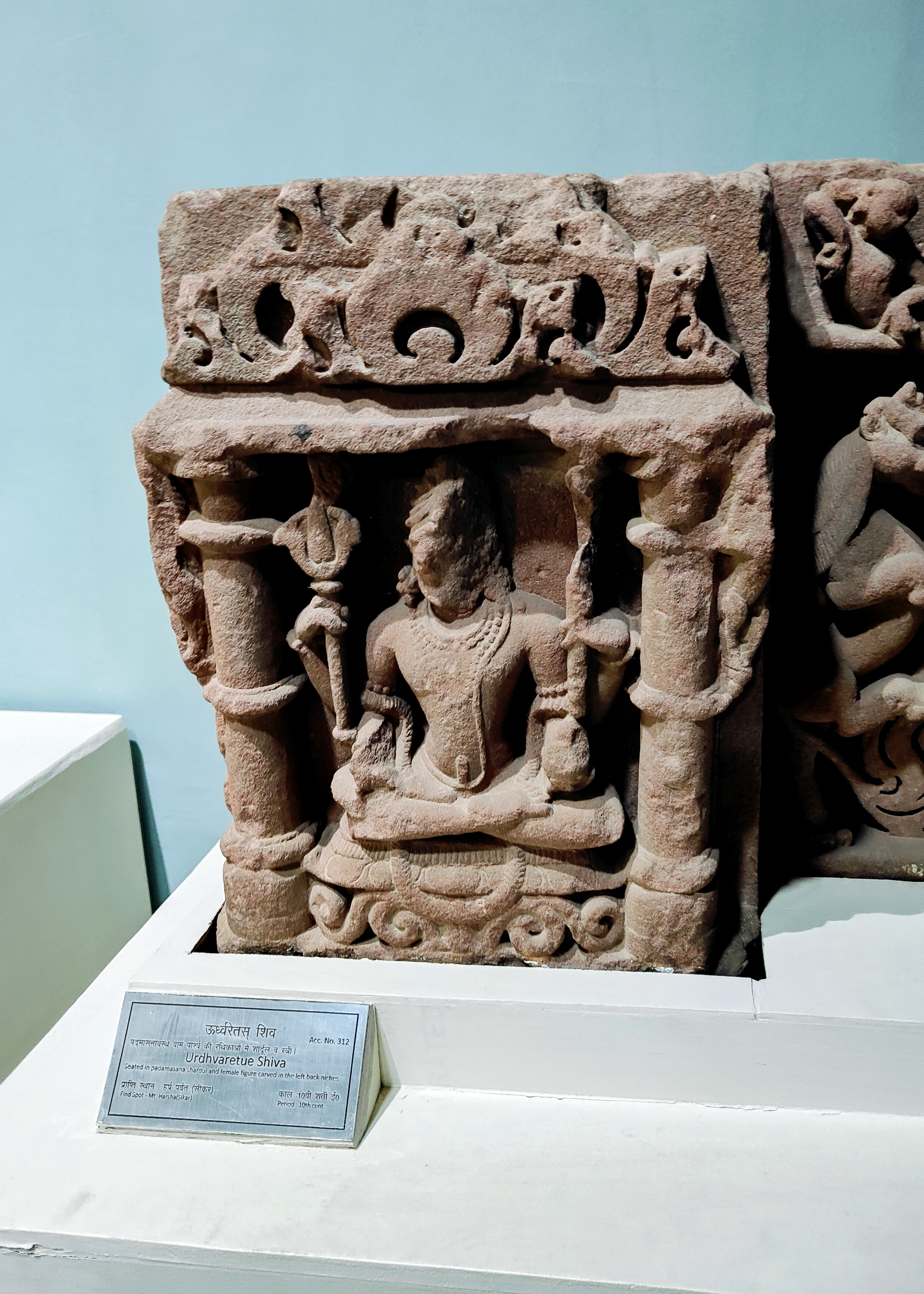 This Shaiva figure was possibly part of a deva-kostha or sculptural niche placed on the walls of the now-lost Shaiva shrine. The four-armed seated figure holds a trident and a staff in its upper two hands, while the lower two hands are significantly damaged. The figure is ithyphallic and represents the Urdhvareta aspect of Shiva, signifying full control over vital energies through ascetic vigour. This is likely an image of Lakulisa, the preceptor of the doctrine of Pashupata tradition. Given that the Harshnath Temple was clearly under the control of and likely erected by the ascetics of the Lakulisa-Pashupata tradition, the depiction of Lakulisa on temple walls comes as no surprise. Image Courtesy: Government Museum, Sikar