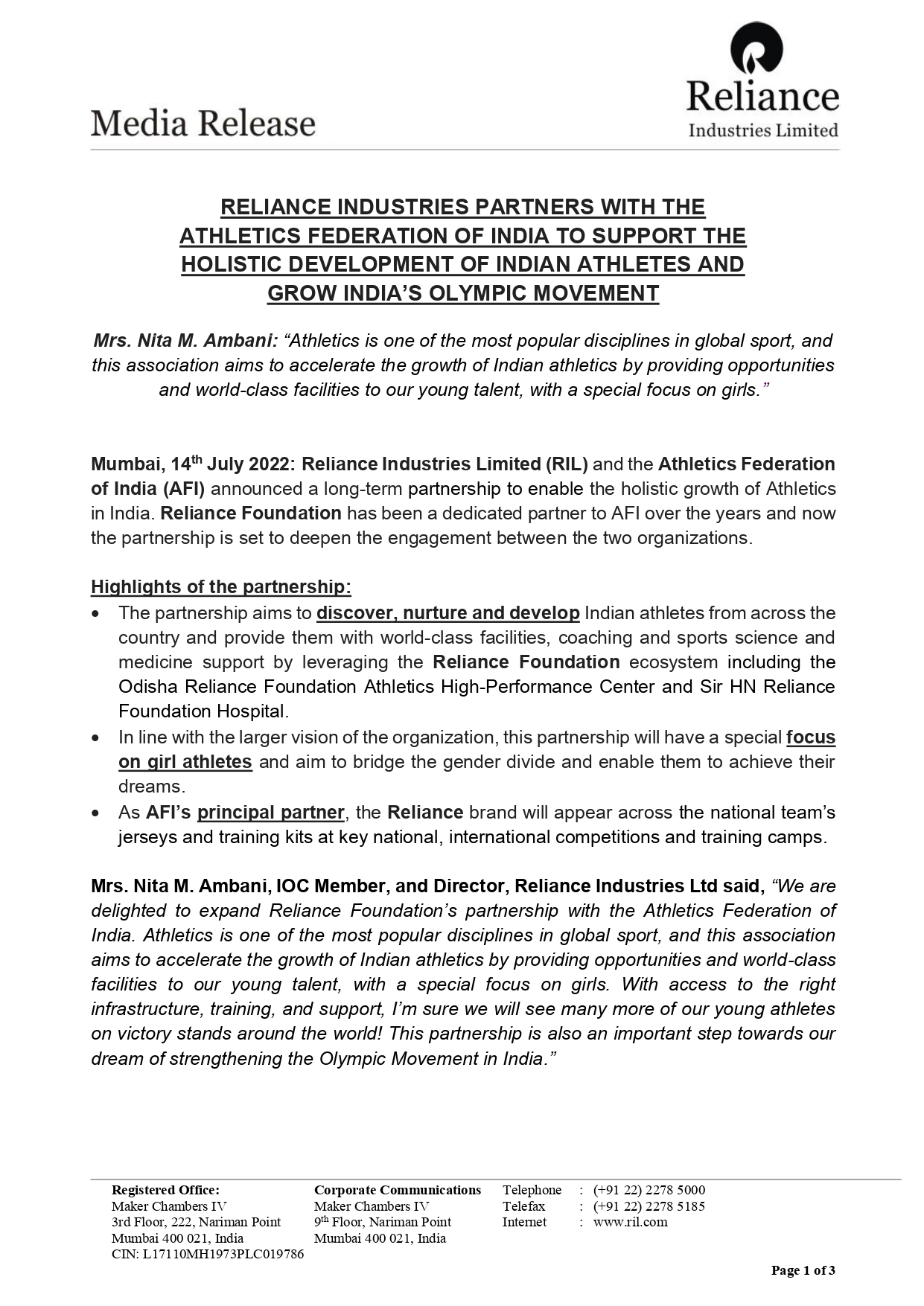 Reliance Industries partners with the Athletics Federation of India Public Deposited