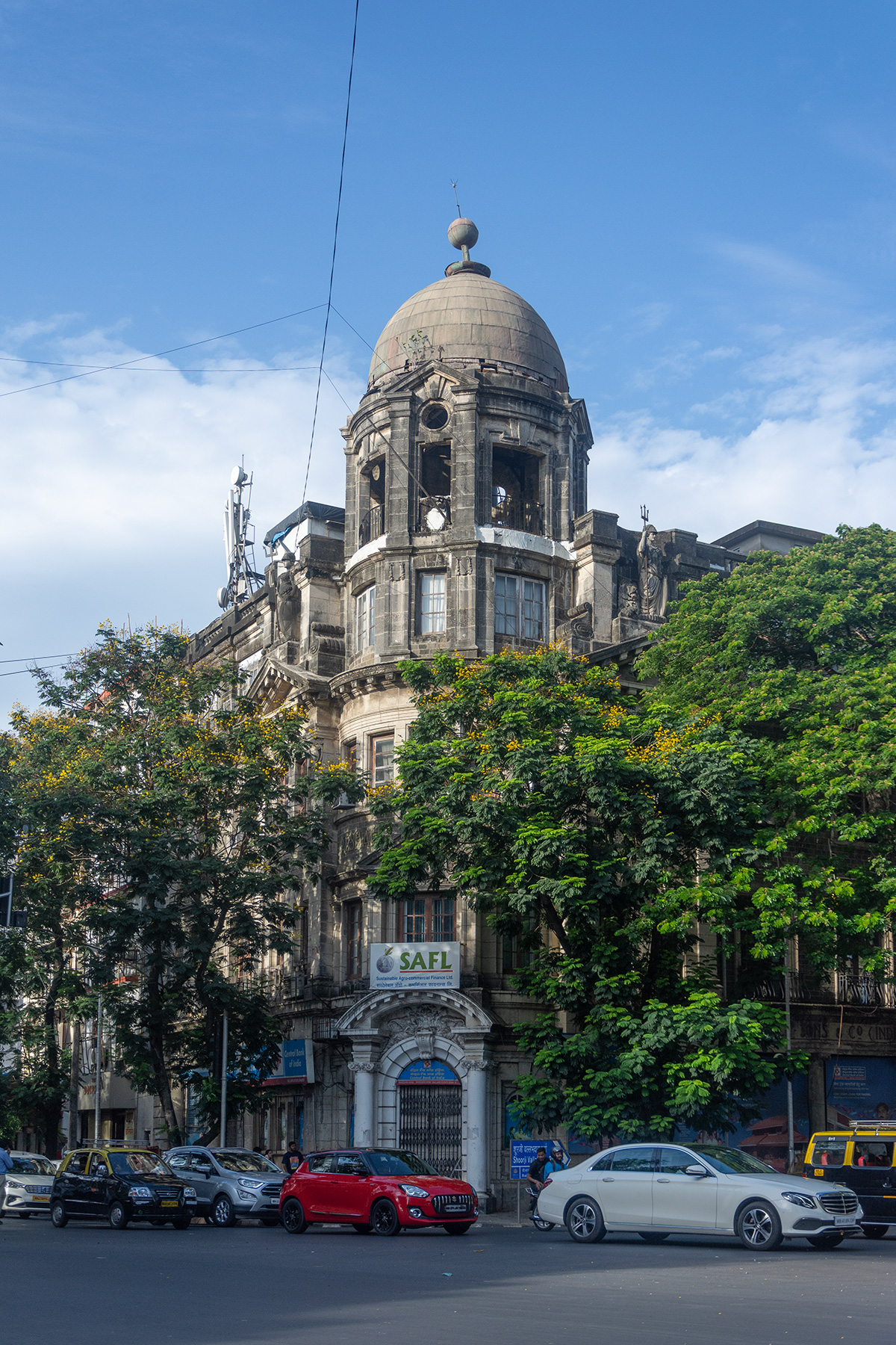 The imposing Marshall Sons and Co. is a corner building at the intersection of Shoorji Vallabhdas Road and Shahid Bhagat Singh Marg. The building was designed in Edwardian Baroque style by architect Charles Frederick Stevens, son of the late Frederick W Stevens who had been Mumbai's most celebrated architect during the Victorian Gothic phase.