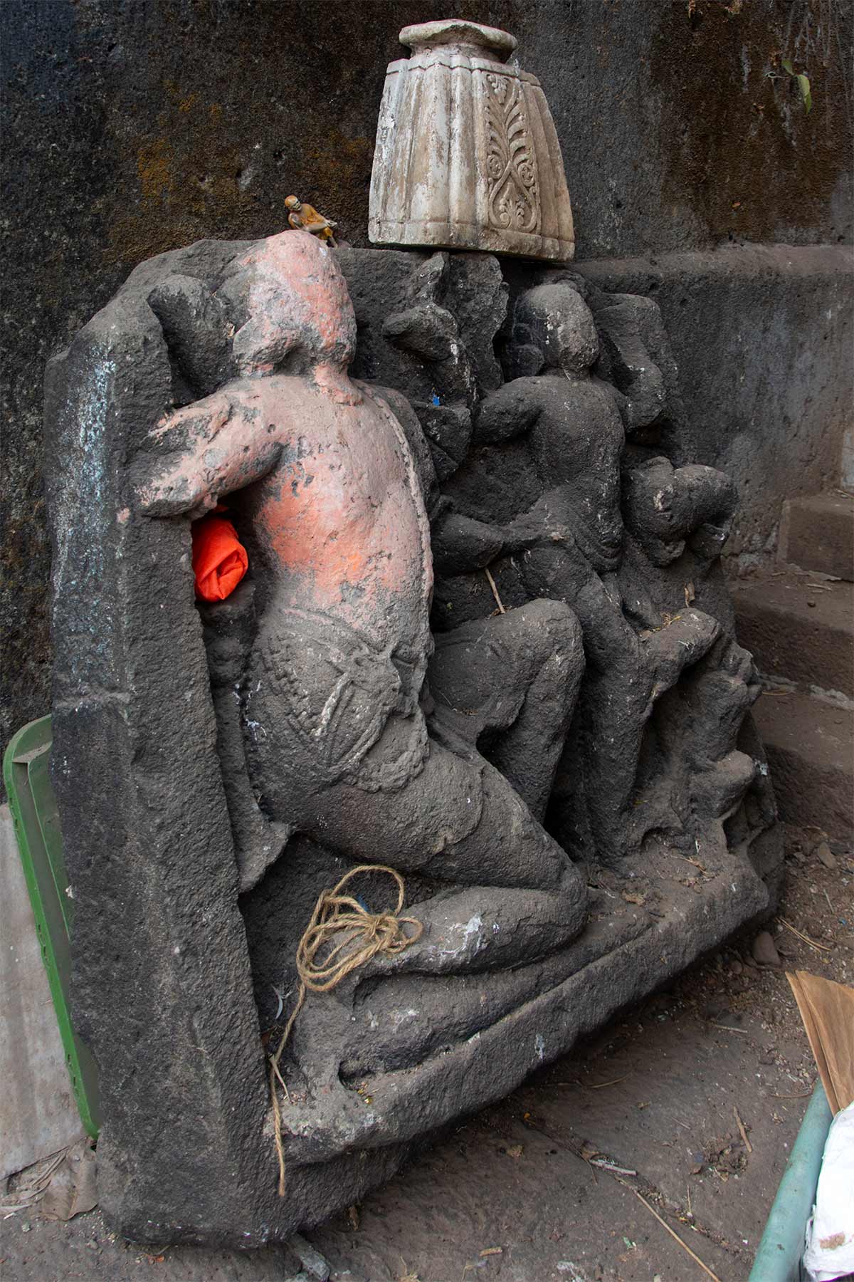 This heavily eroded panel is placed on the steps leading down to Banganga Tank. These stone panels are believed to have been part of from the old Walkeshwar Temple built by the Shilahara rulers. After the temple was demolished by the Portuguese, many of the broken pieces were salvaged and now lay scattered around the tank. The British took some of the better-preserved carvings to England and are now displayed at the India House Museum at South Kensington.