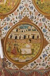 The fifth oval painting (in clockwise order) in the lower/outer circle in the ceiling of the mandapa (pillared hall) is the episode where Jinadatta Suri saved the life of an unwell child brought to him by two women. The episode takes place outside a haveli, probably near the place where the acharya (those who impart knowledge) is meditating. The acharya is shown blessing the child by placing his palm on the child’s head. The inscription reads, ‘Shri Jinadatta Suriji balak jivayo.’