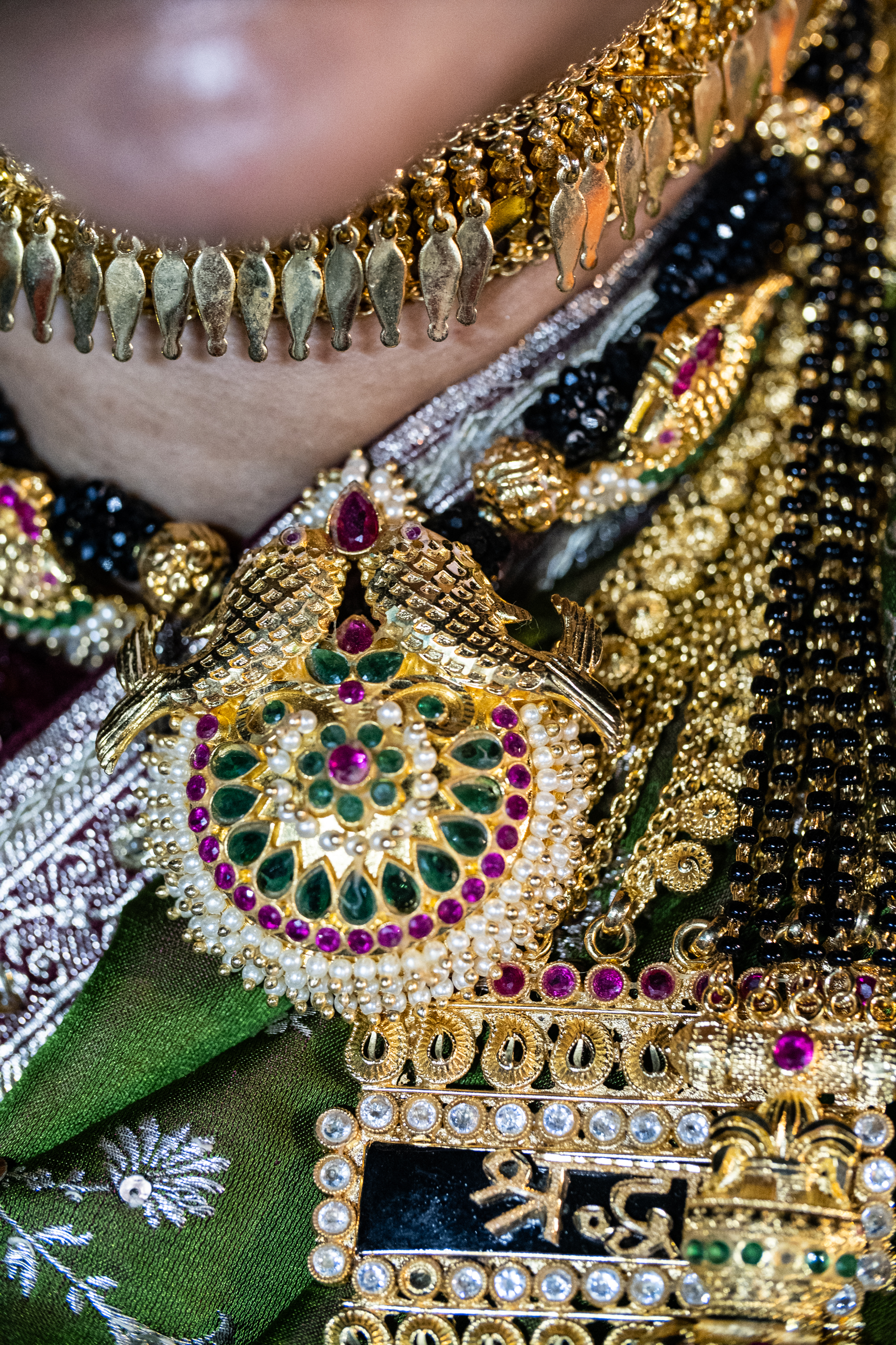 Married women wear thauja, a thick mangalsutra (necklace) with multiple strands of black beads, typically consisting of five or nine strands. The woman in the picture is wearing a thauja with a pendant featuring the double fish motif, symbolic of the fishing livelihood of Kolis.