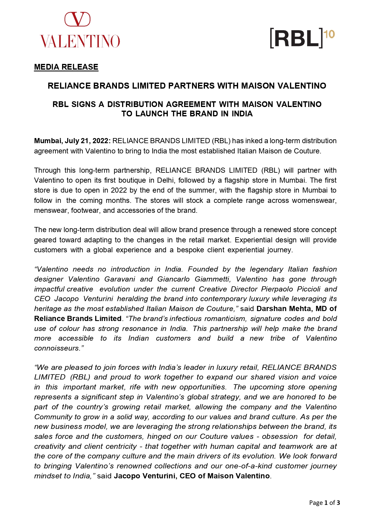 Reliance Brands Limited partners with Maison Valentino Pubblico Deposited
