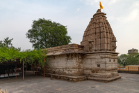 View of the mulaprasada (main temple) from the southwest. The garbhagriha, unlike the mandapa exterior, shows some decoration on its façade. The garbhagriha stands on base mouldings with jaali (checkered) windows and chaitya arches. It has a simple latina-type shikhara (spire) with niches topped by udgama pediments (pediments with interconnected chaitya dormers) which look like miniature shikaras. At the apex, an amalaka is placed topped by bijapuraka (citron fruit).