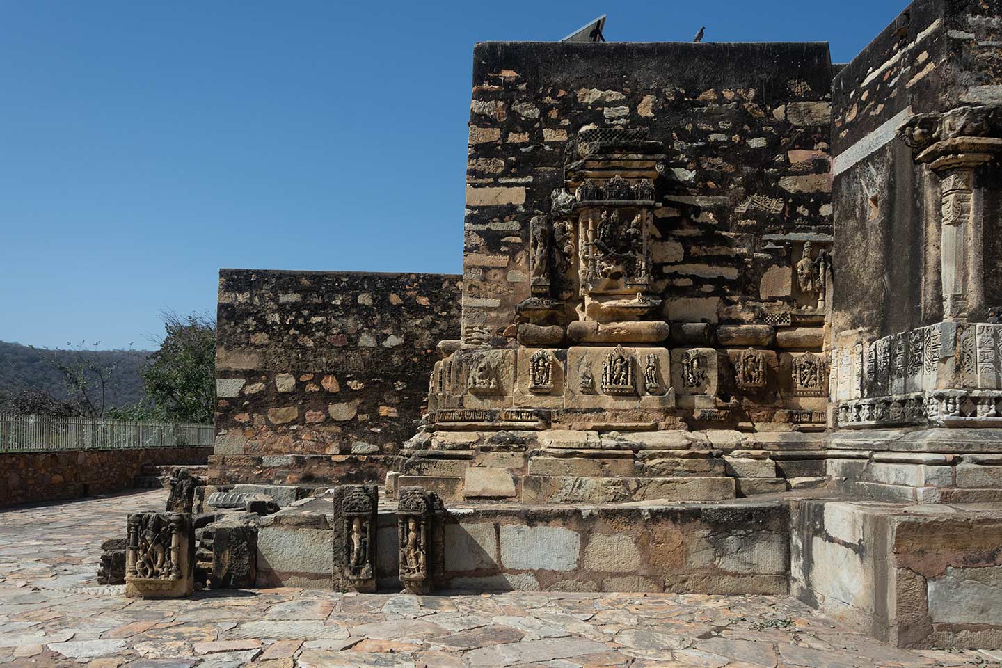 This is the view of the rear elevation of the southern shrine of the triple-shrine Neelkanth Mahadev Temple. The exterior walls of this shrine have completely collapsed and were replaced at a later point with incongruously added wall portions. In rebuilding these walls, architectural members of the original temple have been repurposed haphazardly.