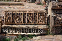 It seems that the beam, richly carved with human figures, was likely placed on the varandika of the temple, the adjoining portions between the temple walls and the spire. The protruding offsets typically feature mithuna figures inside the niches, while the recess between the two offsets is beautifully carved with images of apsaras or women engaged in different actions such as carrying children, weapons, etc. The male figures are often portrayed with weapons and accompanied by female companions. This fragment is one of the loose architectural fragments on Harsha Hill.