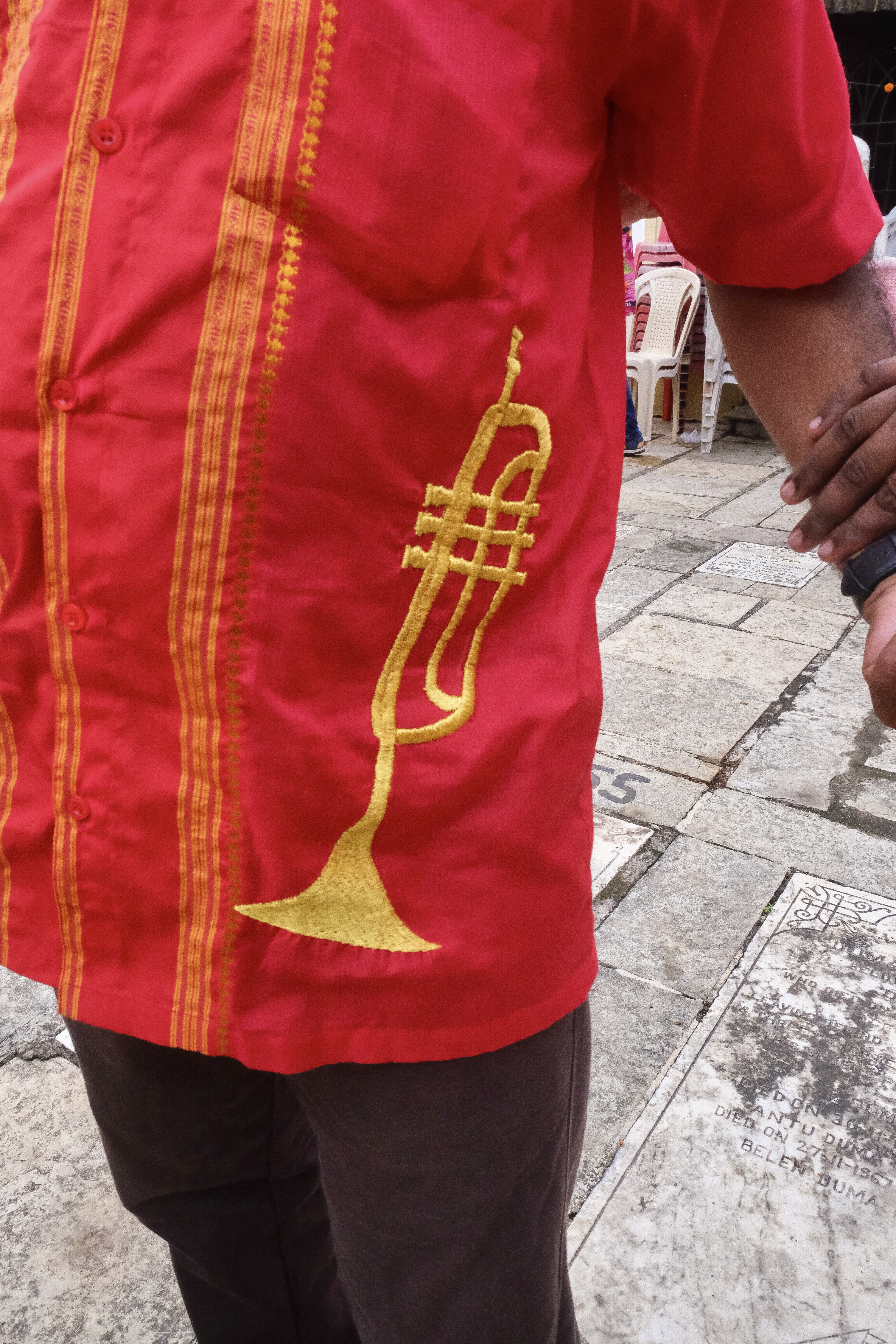 Music is integral to the East Indian community. This man has his favourite musical instrument, the trumpet, embroidered on his shirt.