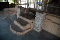 A closer look at the stairs, leading to the mandapa, shows that the bottom stair, although lacking carvings, is made like the chandrashila (moon stone) found in ancient temples. The top two stairs were decorated with the original broken parts of the temple at the time of renovation. The pillars which are placed on both sides of the steps are similar to the pillars at the entrance of the temple complex.