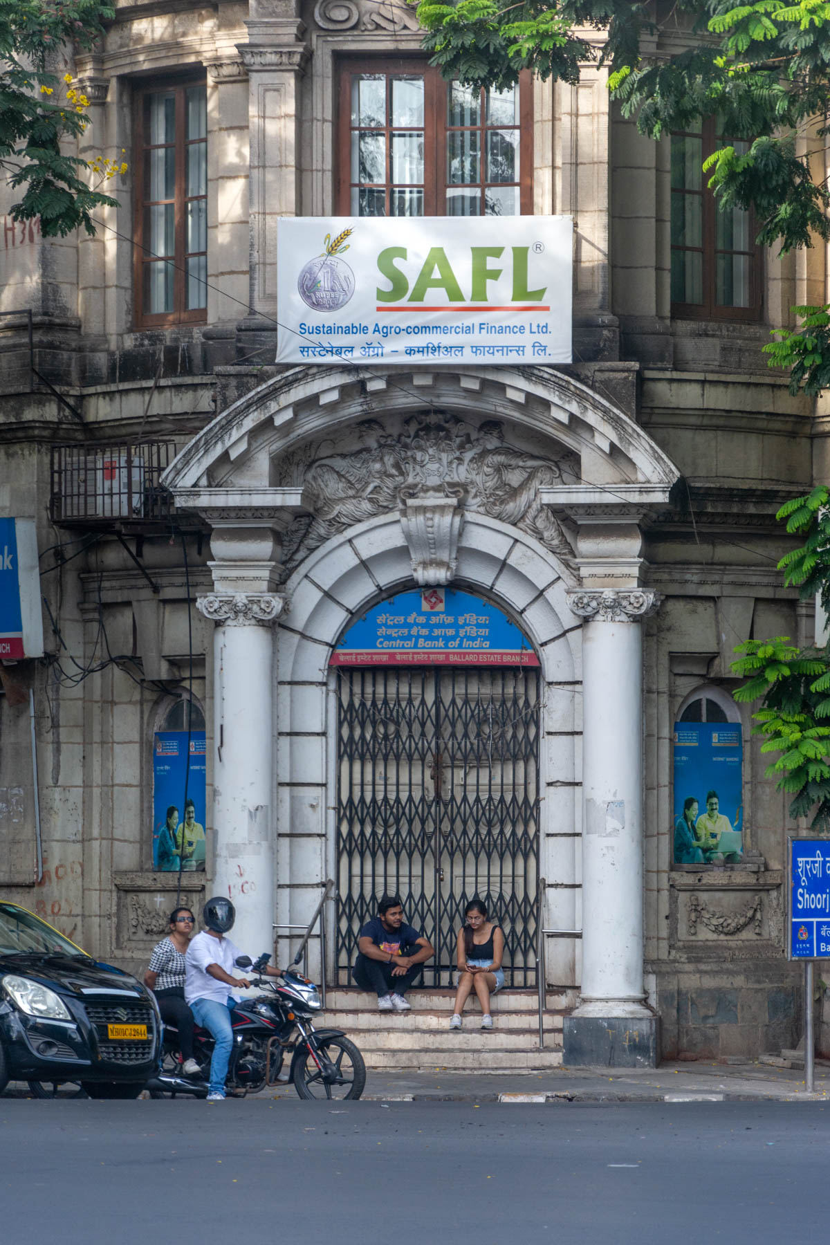 Entrance to Marshall Sons and Co. building, at the intersection of Shoorji Vallabhdas Road and Shahid Bhagat Singh Marg. The entrance has a round pediment with two life-size female figures seated in the spandrel. The year of its construction, 1906, is inscribed above the keystone.