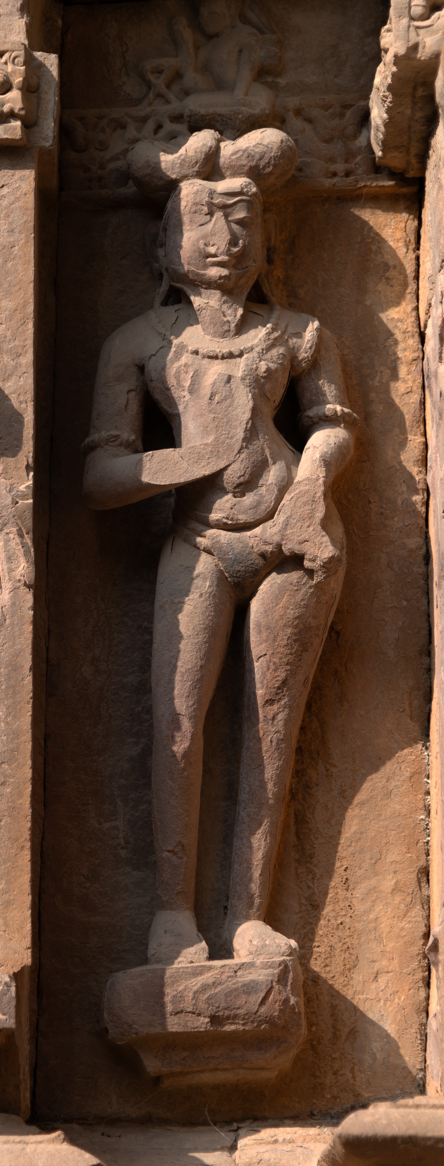 One of the ascetics is adorned with a sacred rudraksha mala and a rudraksha armband. The rudraksha (dried stones or seeds of the Elaeocarpus ganitrus associated with Shiva iconography) holds special significance as the sacred symbol of Lord Shiva. It means ‘tears of Shiva.’ According to a legend, once when Shiva was performing penance, tears shed from his eyes and he fell to the ground. Eventually, these transformed into seeds that sprouted into a tree. Thus, this visual depiction of a Shaiva ascetic forms a profound association between the devotee and their lord.