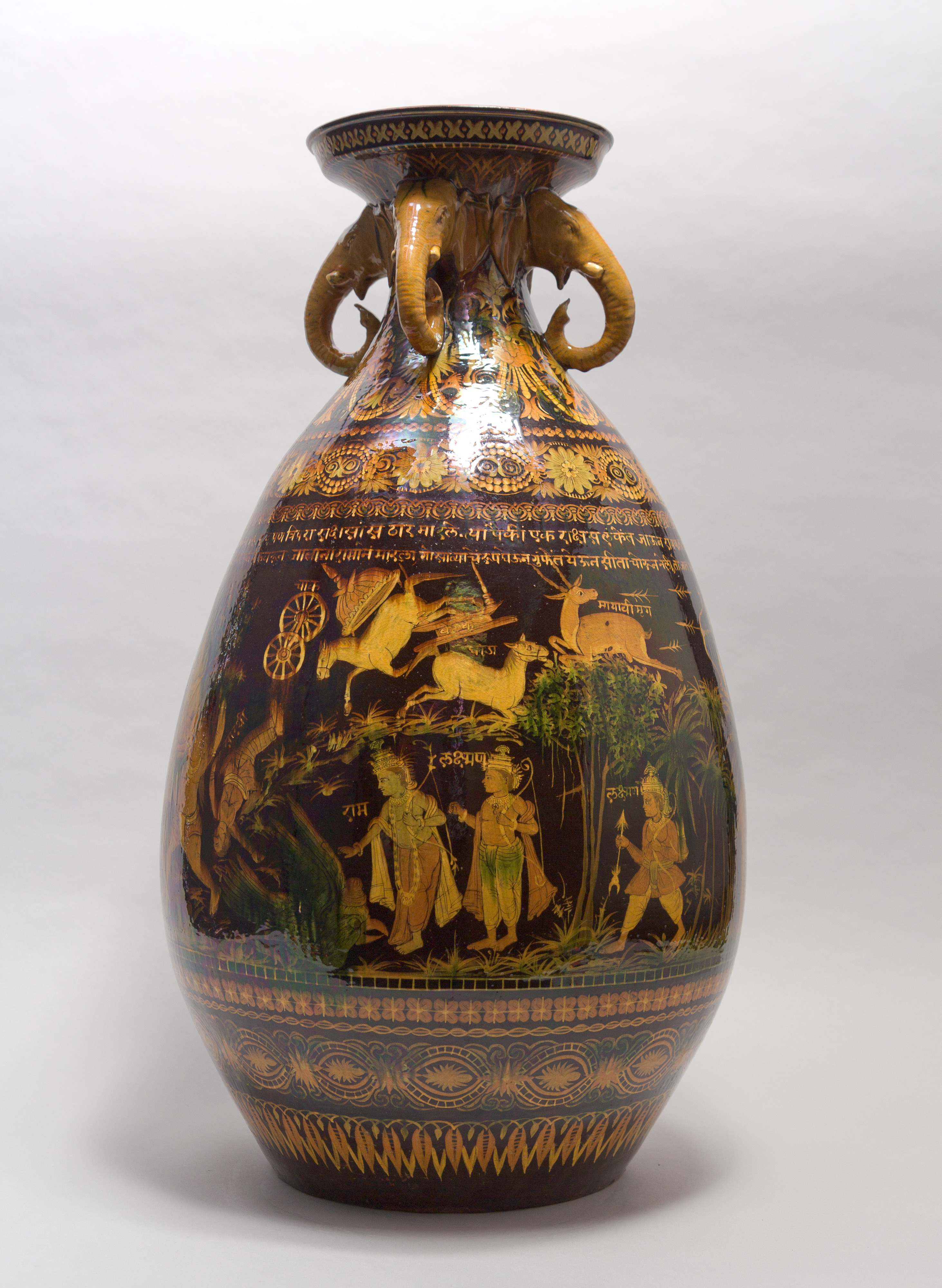 Drawn from the third book (“Aranya Kanda”) of the Ramayana, the elaborate narrative on this vessel depicts key scenes in the Dandaka forest. Created by the Bombay School of Art in an effort to preserve Indian craft, the object features many embellishing motifs drawn from the Buddhist murals of Ajanta. These features include the lotus and pearl band running around the shoulder and the monster faces (kirtimukha), set between the addorsed elephant heads, that spit out a garland of jewels. Although the vase is grounded in the Indian tradition, British neoclassical taste clearly underlies its shape and some of its geometric motifs. Given the scale and inscribed multiscene narrative, this vase may have been produced for the London Colonial and Indian Exhibition of 1886.