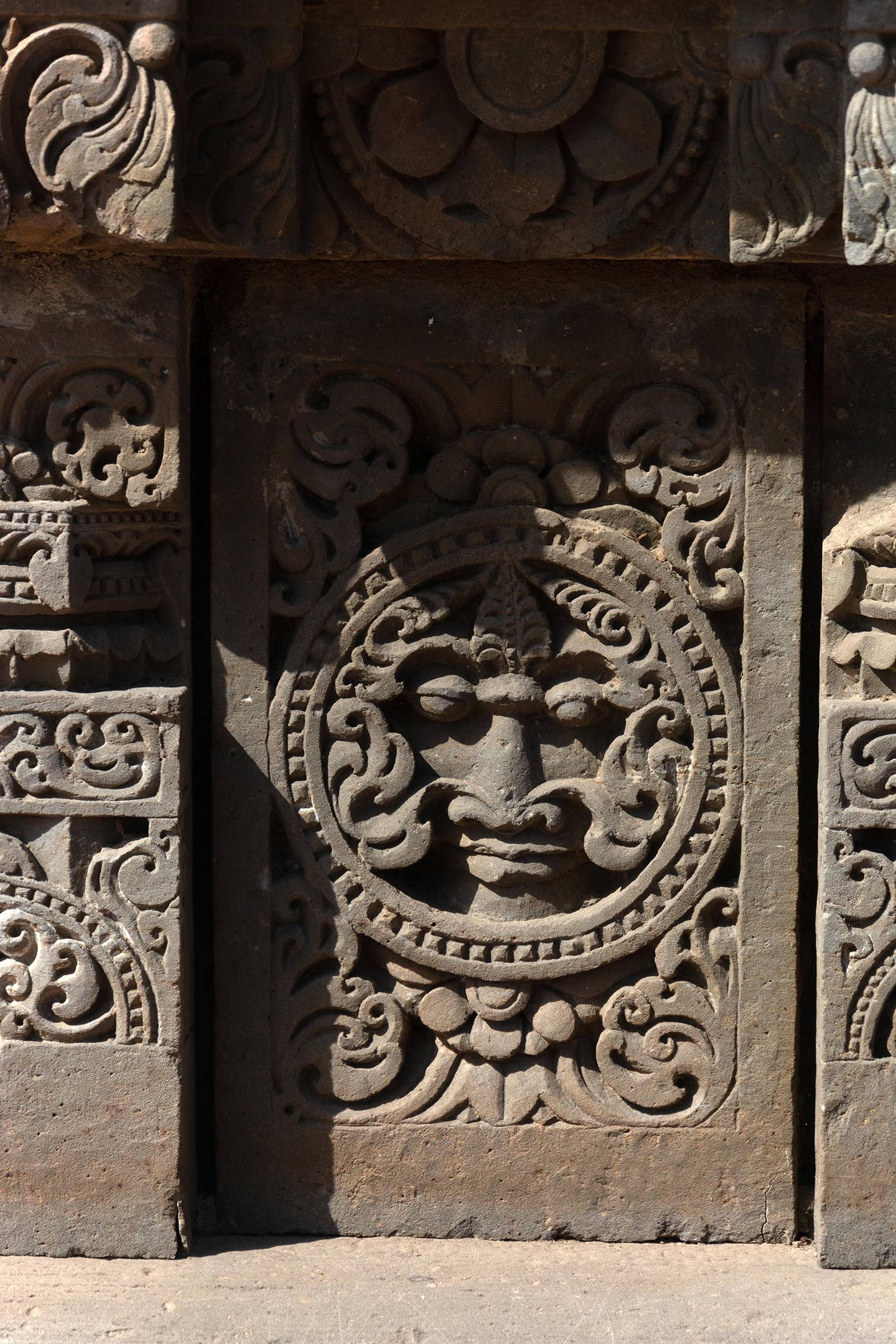 Tablet-like plaques are placed on the adhisthana (facing east). These plaques depict various types of flora and fauna as well as hybrid creatures like kinnara, vyala, and makara. The plaques are tightly arranged, richly detailed, and deeply carved, creating contrasting shadows that make the artwork look three-dimensional in sunlight. The central artwork of the plaque is in the form of a circular medallion surrounded by a foliage motif. This plaque features a kirtimukha (face of glory) with ardha padma (half lotus) and kalpa lata (creeper) motifs covering the rest of the plaque surface.