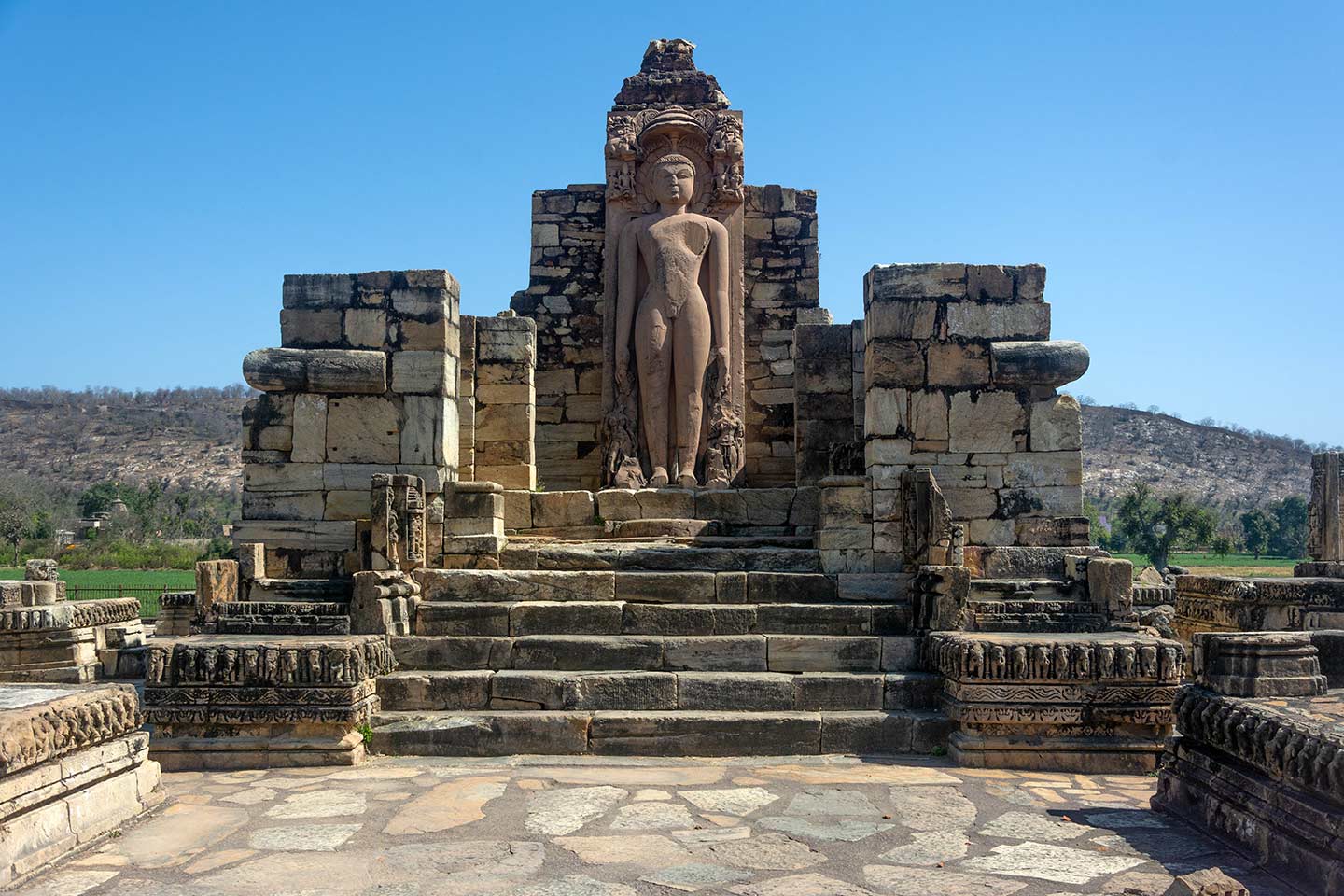 The ruinous Naugaza Shantinatha temple houses the colossal Jina Tirthankara Shantinatha image in its garbhagriha (sanctum sanctorum). Only the exterior plinths of this temple have survived. These are decorated with elephant friezes and geometric patterns.