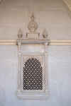 The Aga Khan Maqbara features intricate lattice work on the windows of its central chamber. The structure is built primarily of sandstone, with white marble cladding used sparingly for ornamentation embellishments