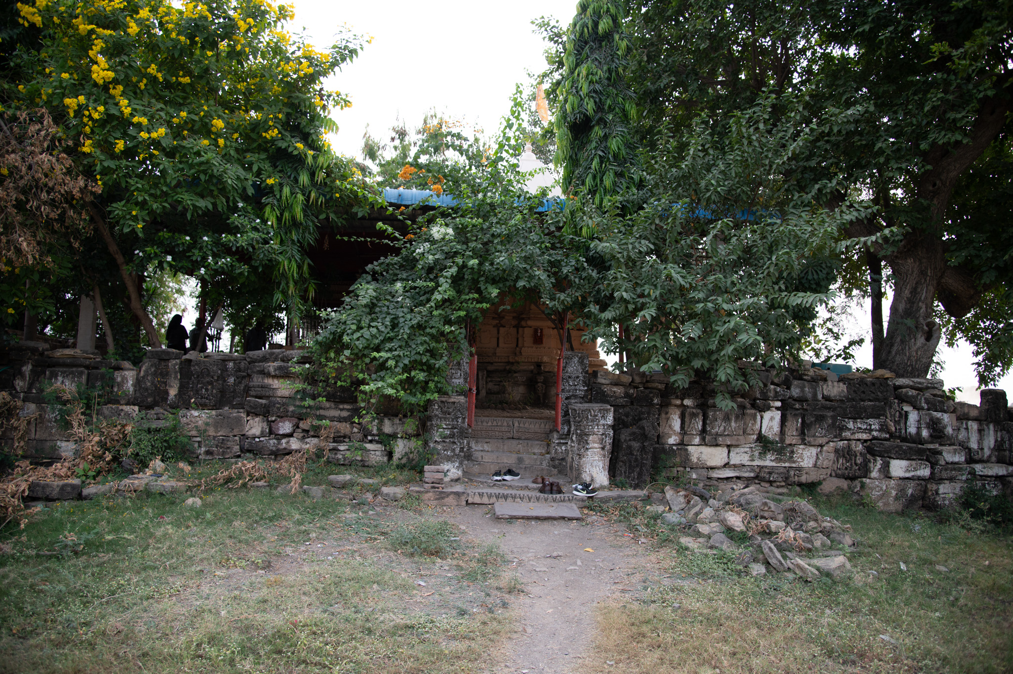 A closer view of an entrance on the north side of the temple premises. This entrance might not be the original entrance as there is a high possibility that the main entrance was located at the front and not to the side of the temple. But currently, this entrance serves as the main entrance with a metal gate, flanked by two carved pillars. On both sides of the entrance, broken fragments of the temple are arranged to form a boundary wall around the temple complex.