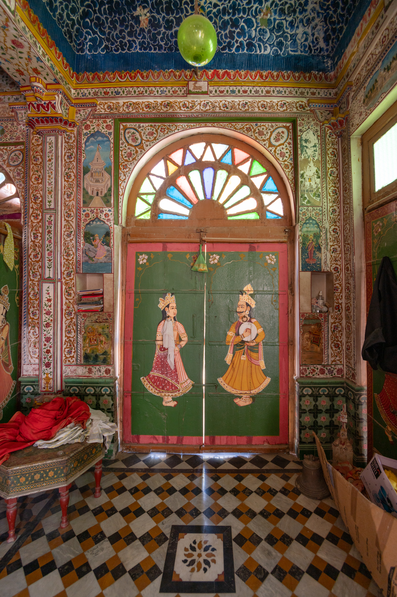 Closer view of the doorway along the northern wall of the mandapa (pillared hall) of Bhandasar Temple. The rectangular frame that holds the door has paintings, however, the arch and the doorway are in a different style. The painting of the musician couple has been added to the wooden doorway in the last decade or so. The addition of stained glass type of glass mosaic to the semi-circular arch is a colonial period influence. The glass arch is added to the doorway only from the inside. The exterior side of the same arches is closed.