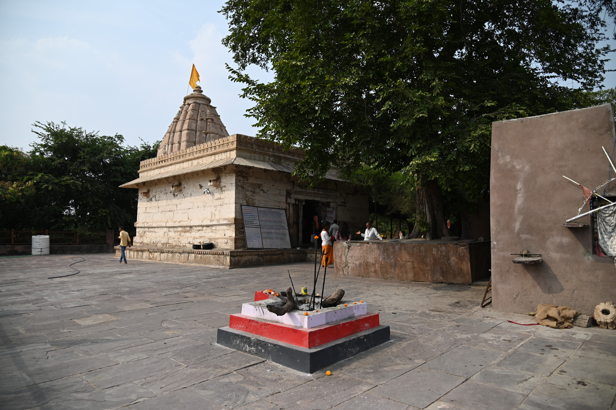 Southeast view of the mulaprasada (main temple). Comprising a mandapa (hall), antarala (vestibule or antechamber), and a garbhagriha (sanctum sanctorum) on its plan, the temple has a simple elevation with minimal decoration. Outside the main temple, there is a yajnakund for performing yajna and havan (fire rituals).
