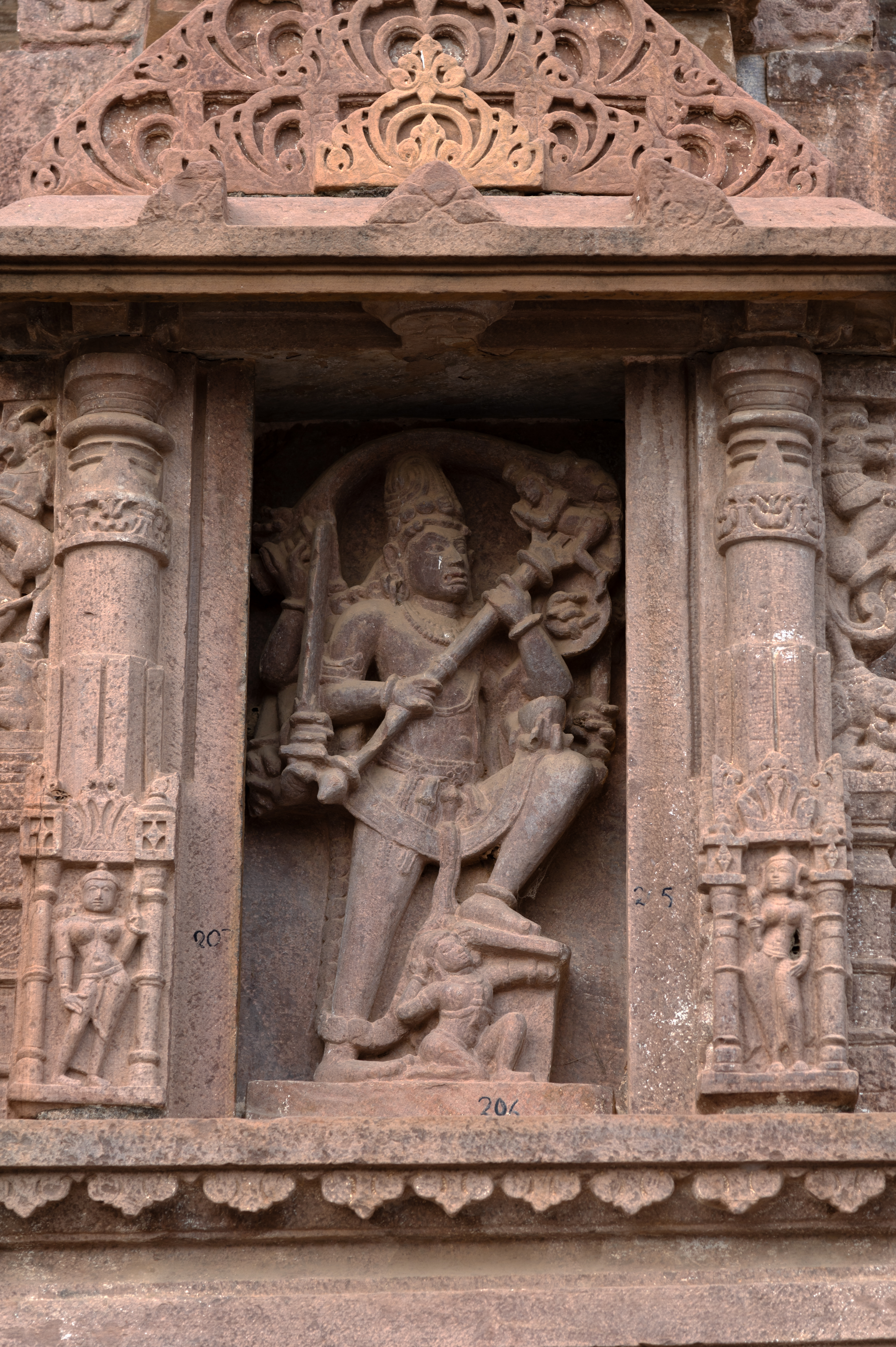 The south-facing bhadra (central projection) of the Mahanlashwar Temple has an image of Tripurantaka Shiva. The left foot of the deity is uplifted to crush the demon. Among attributes, the deity is shown holding a raised trishula (trident), kapala (skull), sword and snake. This depiction of Tripurantaka is complimented with Natesha and Chamunda in the other two bhadras of the temple, indicating the Shaiva affiliation of the temple.
