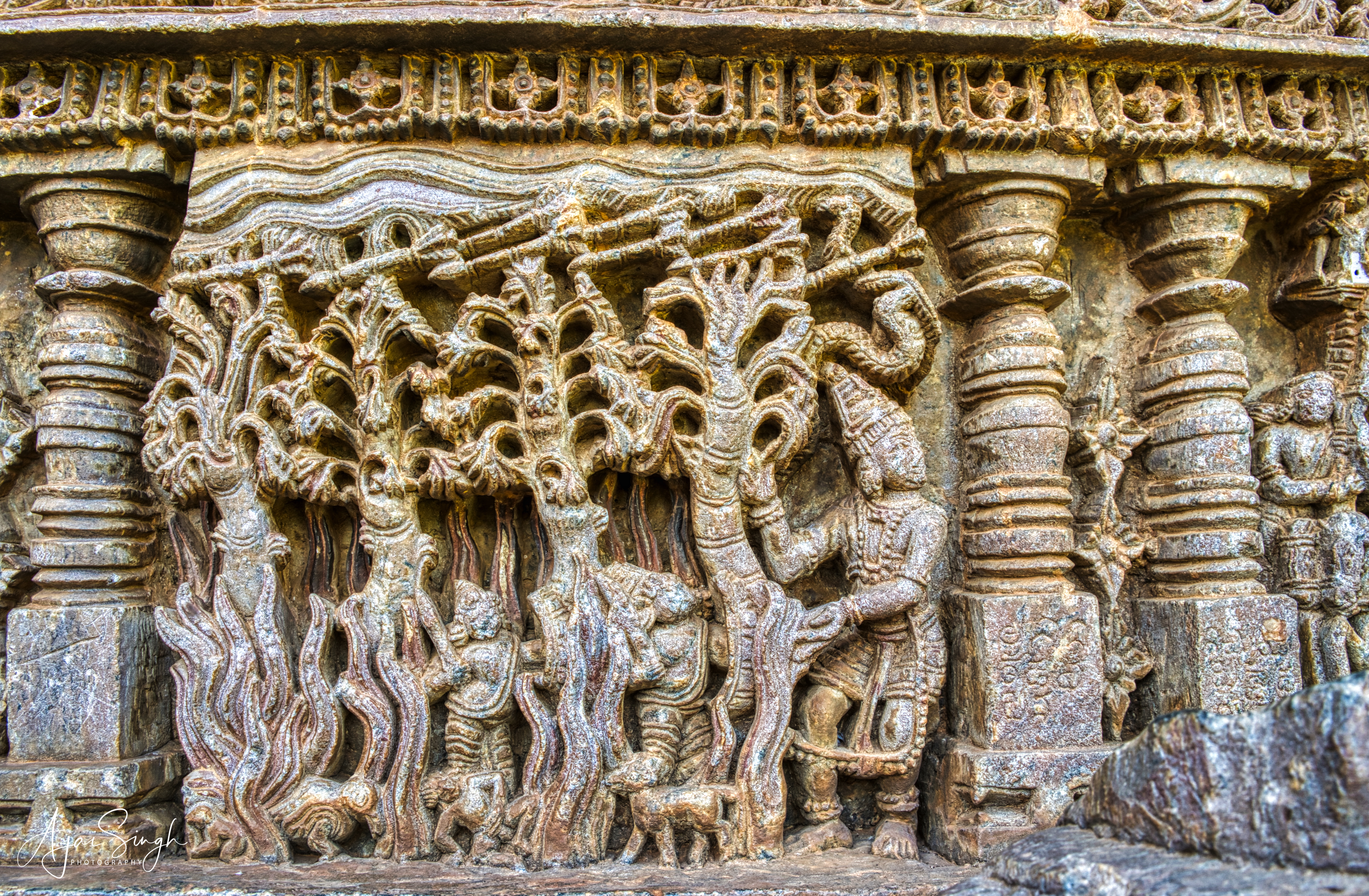 [ Image courtesy: Brig A.P. Singh - www.collectingmoments.in ] If you observe the relief, you can see the arrows on top. Arjuna in order to help Agni, the God of fire, creates an umbrella of arrows to prevent Indra, the God of thunderstorm, from dousing the fire.