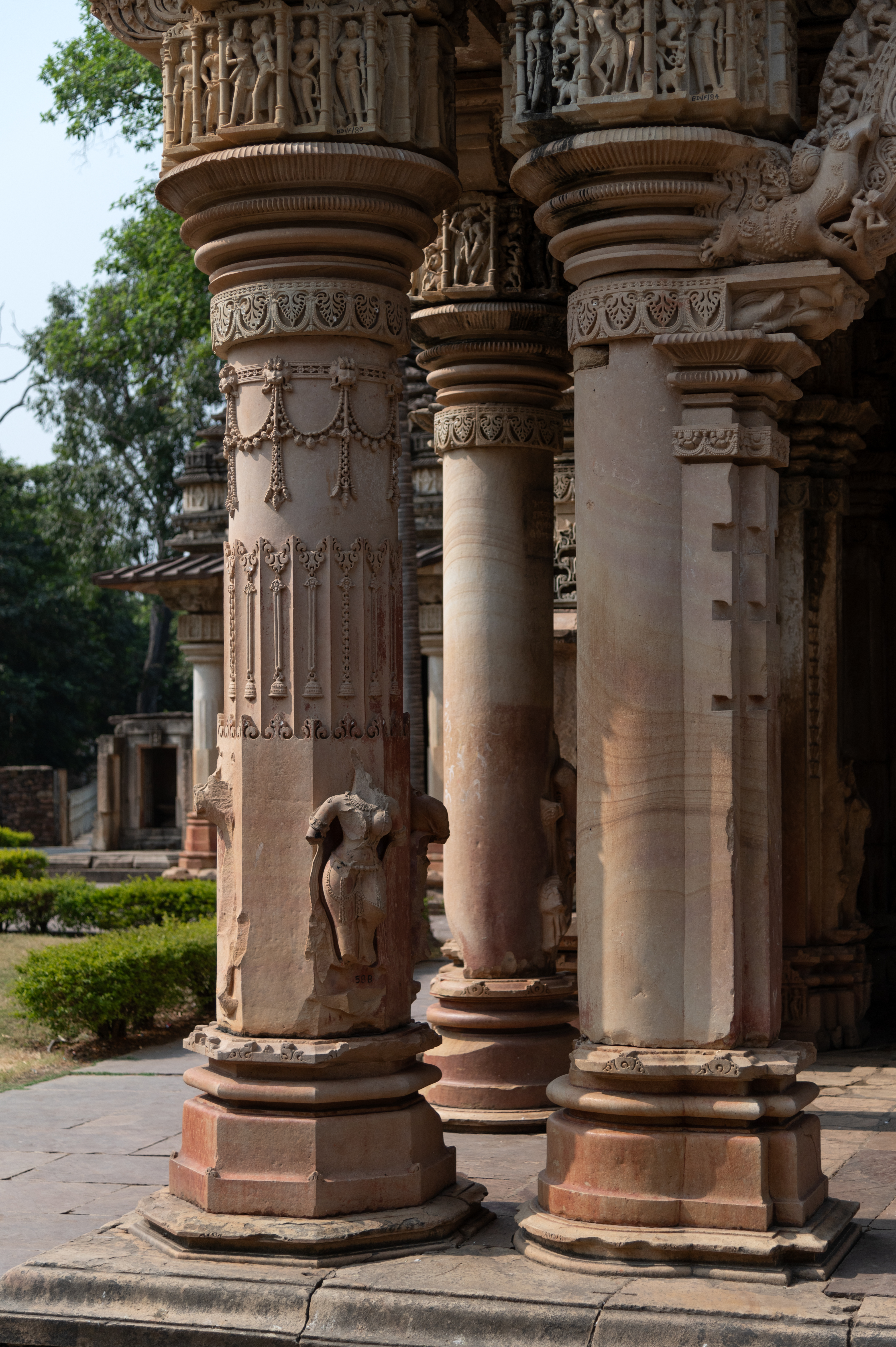 The shafts of the front pillars are adorned with loops of bells and hanging bells. The pillars are adorned with the graceful standing figures of sursundaris (celestial maidens) which are currently broken and damaged. The figural panel at the top of the cushion abacus depicts sursundaris, dancers, and couples.