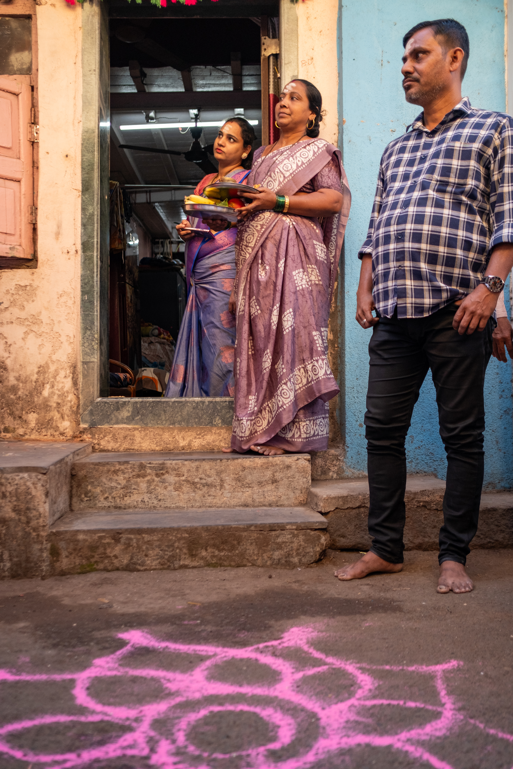 Women wait in anticipation outside their homes with an aarti thali in hand to welcome the palki procession. The thali (plate) usually contains a diya (oil lamp), incense sticks, marigold flowers, and raw rice grains. A small bell is rung during aarti to invoke the divine and ward off negative energies.