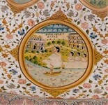 The story in the sixteenth oval painting (in clockwise order) in the lower/outer circle in the ceiling of the mandapa (pillared hall) revolves around Jinadatta Suri, probably depicting how he saved a drowning ship. The acharya (those who impart knowledge) is sitting on the banks of the water body, accompanied by three disciples. The ship in the water has an elephant head, and a person in Rajasthani attire is seated on the ship. The water contains aquatic flora and fauna, such as fish and lotus flowers. The inscription reads, ‘Shri Jinadatta Suri ji ne nevai dari.’ The most interesting aspect of this painting is the name of the artist, M. Altaf, inscribed at the bottom of the oval border of the painting.