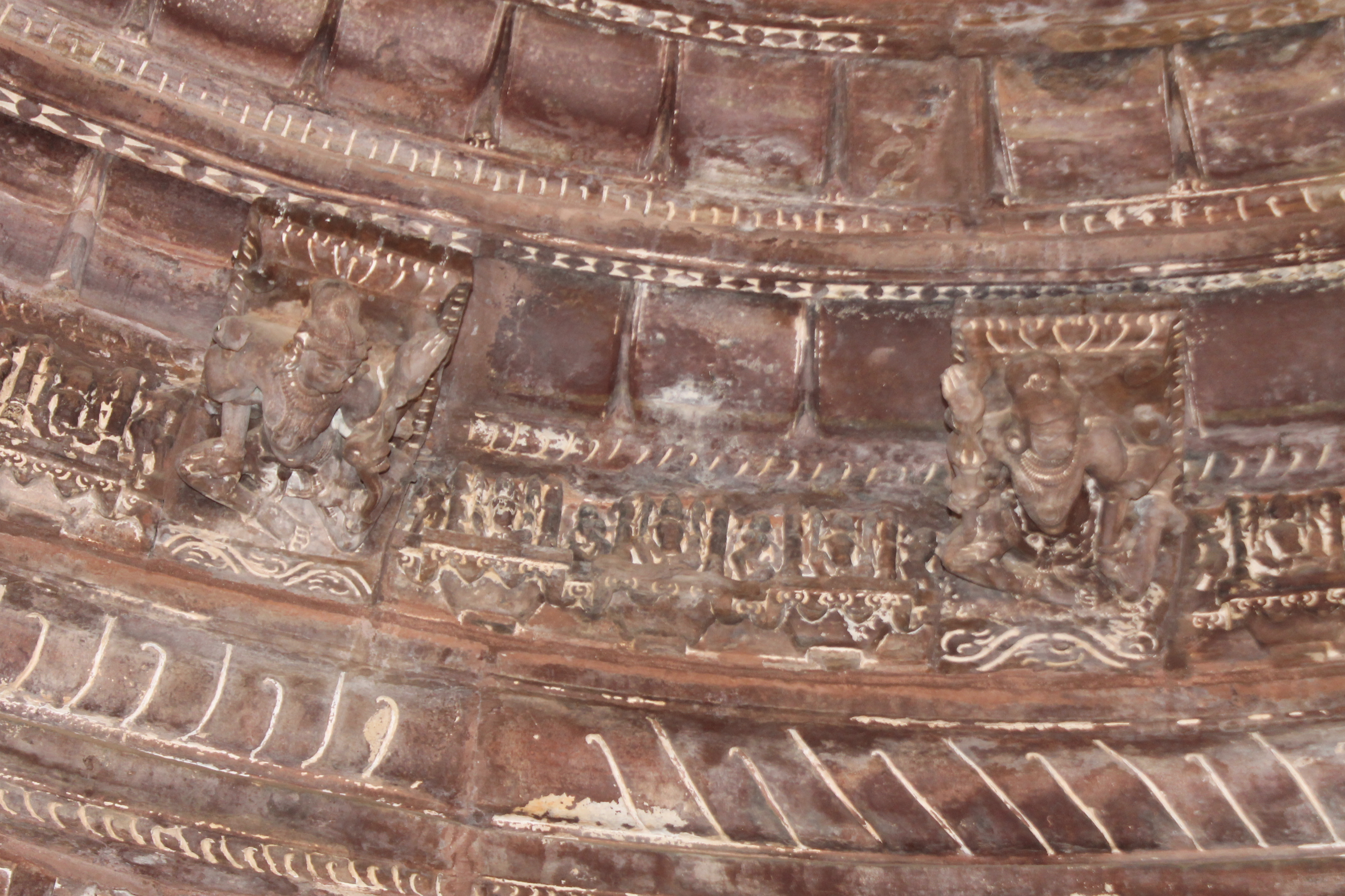 The moulding details and the ornamentation of the concentric circles of the ceiling of the Suhaveshwar Temple are pictured here. The lowermost moulding has bharvahakas (load bearers) and sculptures on brackets, depicting that they bear the load. Individual circles of the ceiling are made up of semi-circular fractals.