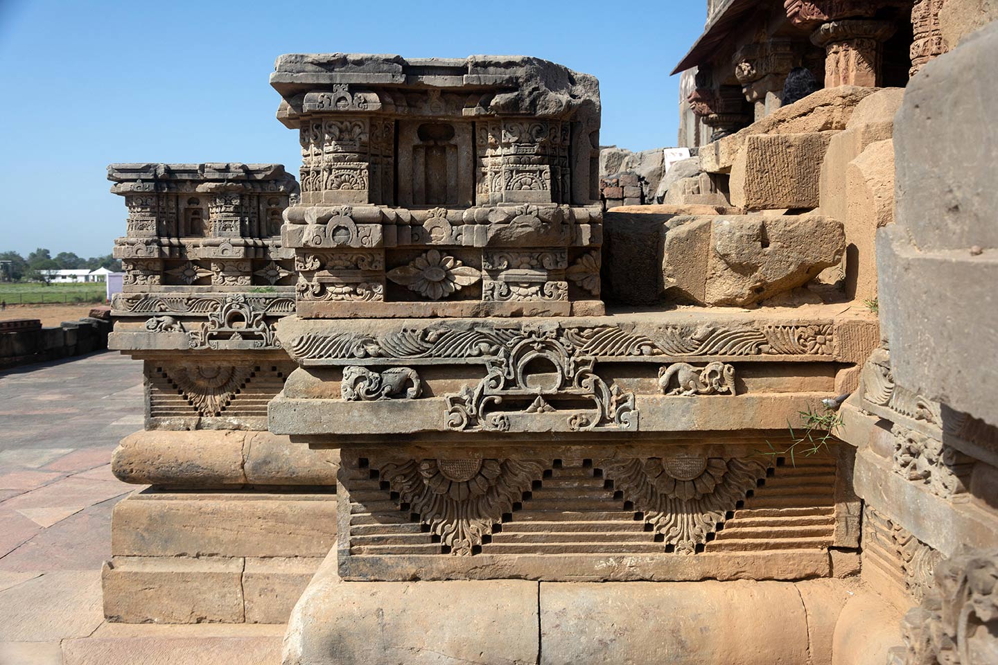 Broken fragments and debris from the original temple assembled on the southeast face of the adhisthana. The stones are tightly arranged, richly detailed, and deeply carved, creating contrasting shadows that make the artwork look three-dimensional in sunlight. The carvings depict various types of flora and fauna as well as hybrid creatures like kinnaras, vyalas, and makara.