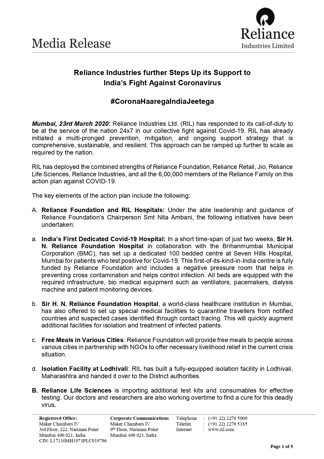 Support from Reliance to fight Coronavirus in India Público Deposited