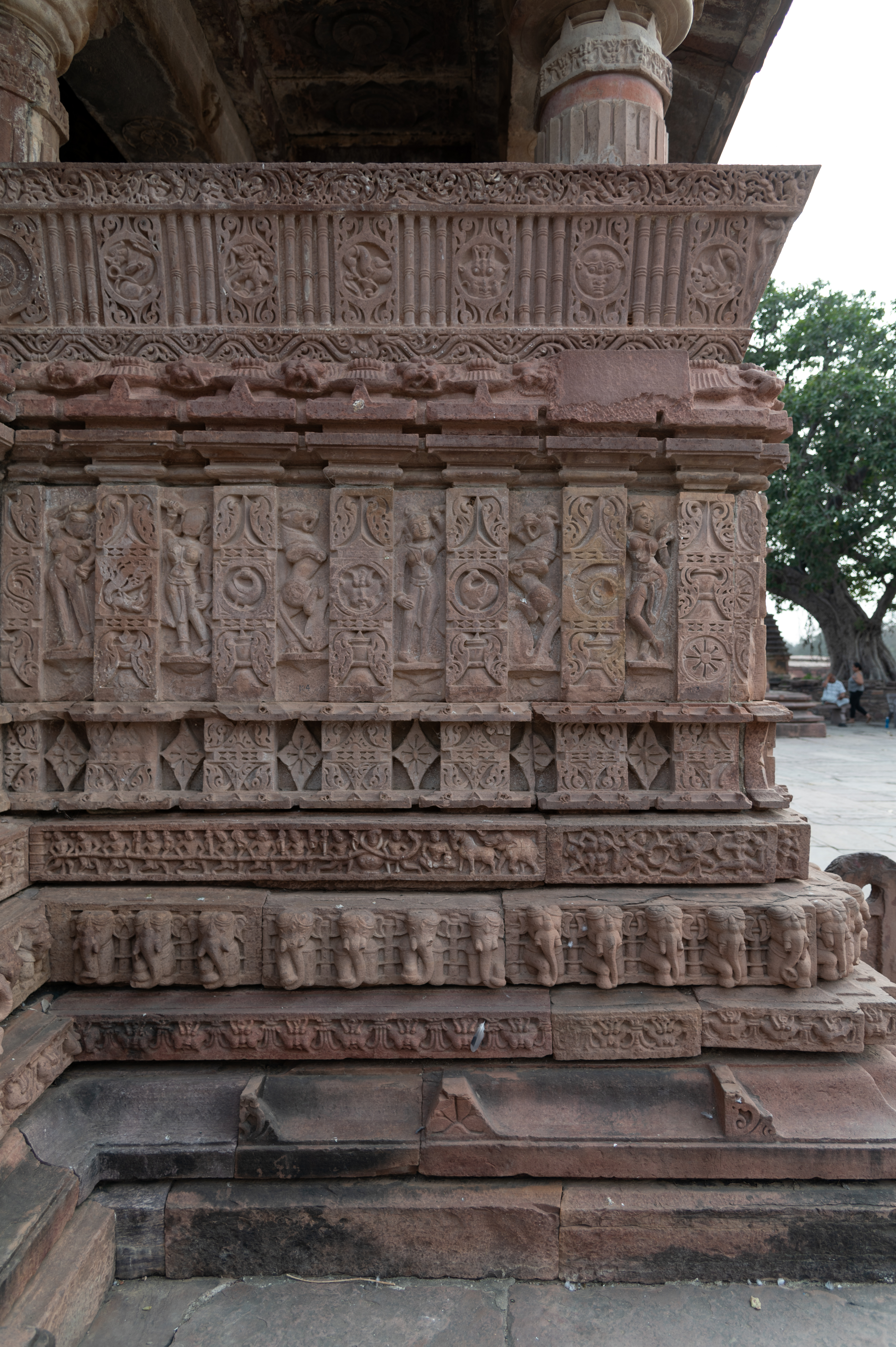 The plinth moulding bands like the gajathara (band of elephants) and narathara (moulding containing human figures) are followed by the kakshasana (seat backs). These have vertical walls which are called the vedika (railing) consisting of rectangular slender geometric patterns that are separated by sculptures. Above the vedika is a slender dwarf wall which acts as the resting backrest from the inside. On the exterior, these slender walls have pilaster motifs with figures in between that are framed by circular niches. The kakshasana is the base of the semi-open mandapa (pillared hall) of the temple.