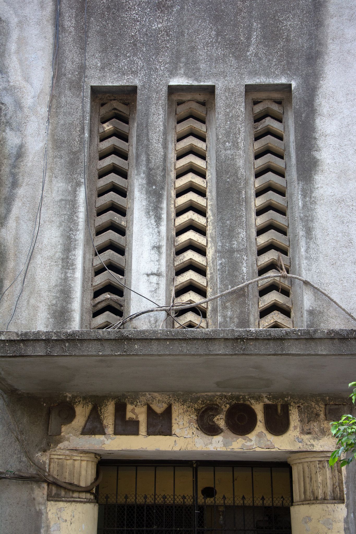 Chevron motif (inverted V-shaped with strong angular repetitive pattern) and Independent font used in lettering, Palm Court.