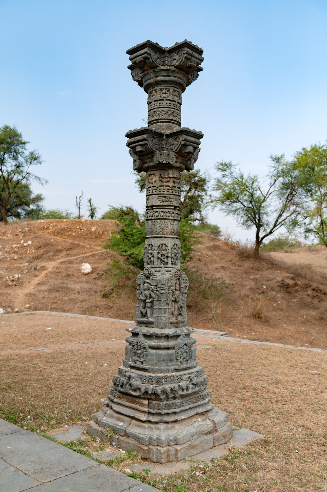 Extant pillar from what was likely a torana (decorative arch) that must have been part of the archway on the northern side of the temple. The pillar is intricately carved based on a multi-moulding plinth in which the base has a row of elephants, or the gajathara (elephant band). The lower shaft of the pillar has three sets of sculptures, and the topmost part of the shaft has two brackets. The torana must have been attached to the bracket remains on the pillar.
