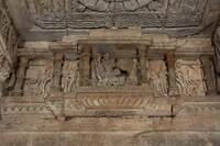 There are sculptures inside deep niches just below the flat ceilings of the aisles of the mandapa (pillared hall). This sculpture is of Shiva and Parvati on Nandi, of which the Parvati’s sculpture is broken. The main sculpture is flanked by two attendants. There is a second niche that is beyond the attendants which has a gavaksha (dormer window) motif.