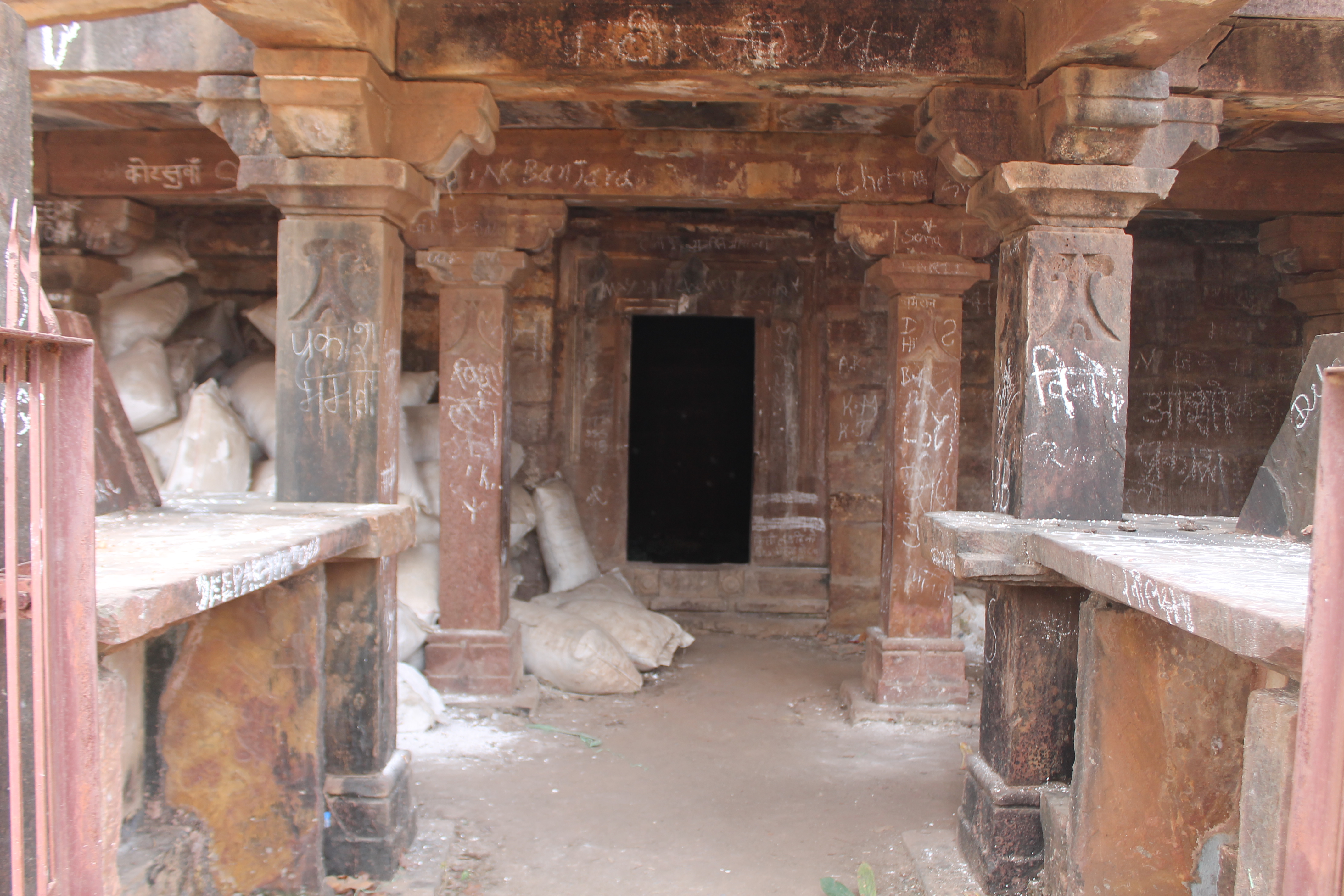 Seen here are the details of the mukhamandapa (front porch) of the matha (monastic or residential building) of the Suhaveshwar Temple. The entrance of the mukhamandapa is flanked by two walls which must have had kakshasanas (seat backs) above it. The corners are marked by pillars. In front of the mukhamandapa is an enclosed space that might have been used as a shrine of the matha. The pillars of the matha are plain, made up of rectangular stone slats with minimal ornamentation.