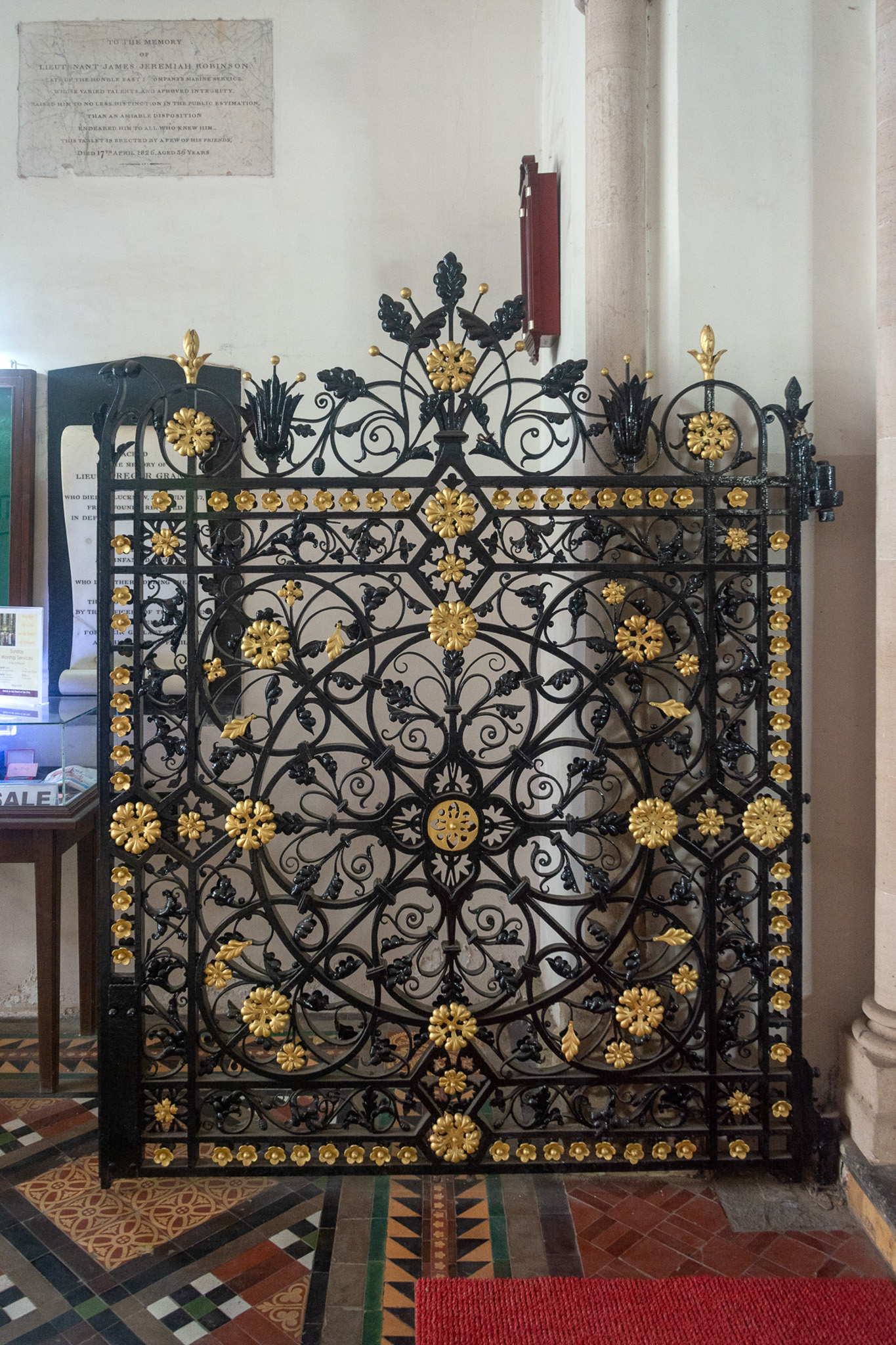 The chancel gate of St. Thomas Church was presented in 1865. Painted in black and gold, the wrought iron gate is intricately designed in a geometric pattern with decorative floral motifs. The detail is typical of Gothic tracery and known as patera, with the use of flowers, flowing creepers, and leaves. The separate floral elements are riveted to the gate.